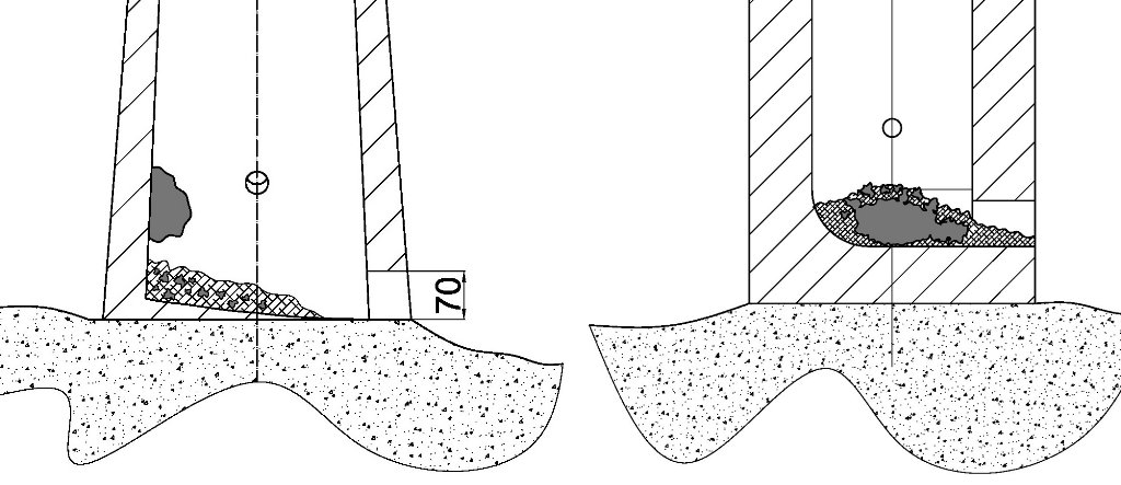 Some 20 kg of roasted ore and 45 kg of charcoal (including preheating) were used in a total time of 4.5 hours. Before the first ore loading, the furnace was preheated for about one hour. In the next three hours of proper smelting, ore and charcoal were added alternately in 1:1 ratio in the quantity of 2.5 kg each. After the last ore charge the furnace was filled only with charcoal and worked for the next half hour. Slag was tapped out every 30 minutes. After this time the furnace was disassembled, and it showed the unusual bloom's location. It was attached to the furnace’s side wall at an angle of 90 degrees, relative to the tuyère (See Figure 10, left). The slag, containing small lumps of iron, covered the furnace bottom. When attempting to compact the bloom, it disintegrated into several pieces. The total result of the process was 2.2 kg of steel, mostly highly carburized.