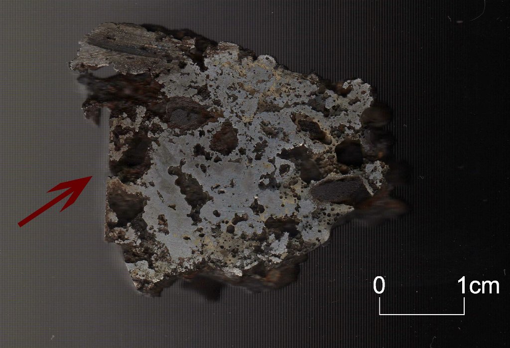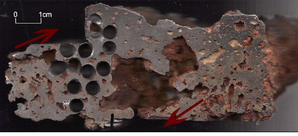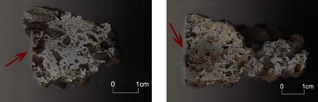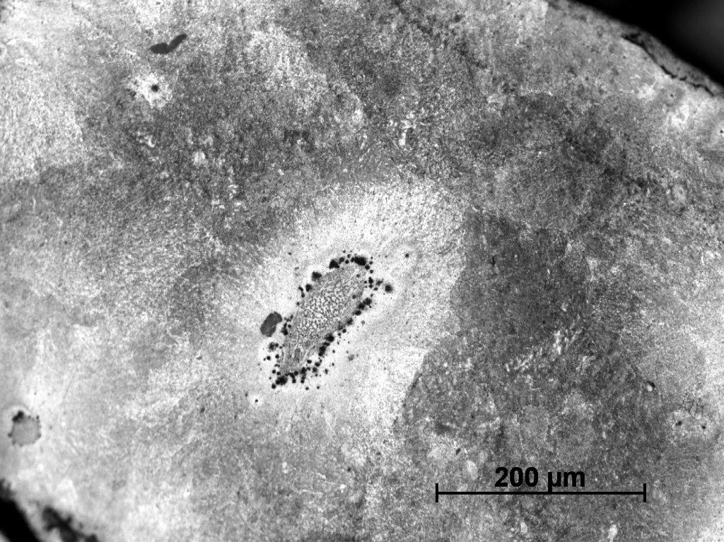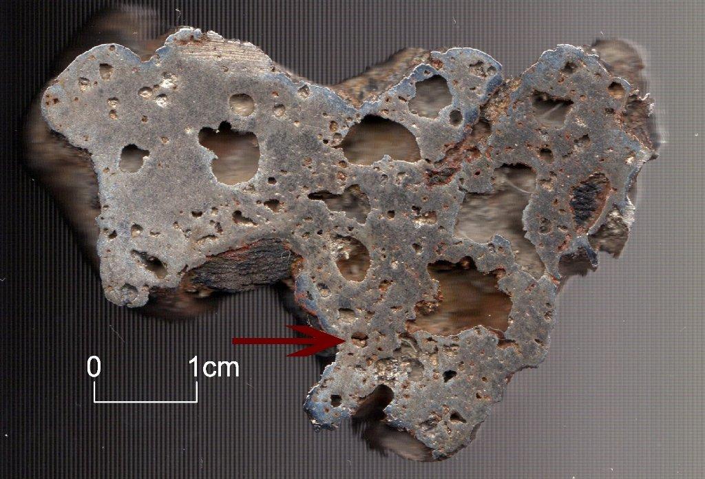 In contrast to the bloom from experiment 1, the iron obtained in this process was a dense and homogeneous lump with only a few fragments not integrated with the whole mass. The voids occurring on the cross-section derived most likely from fragments of burnt charcoal or gas bubbles trapped in the mass of iron. Three samples were taken to analyse: two from the main iron mass (See Figure 11) and the third one from one of the non-integrated parts (See Figure 12).