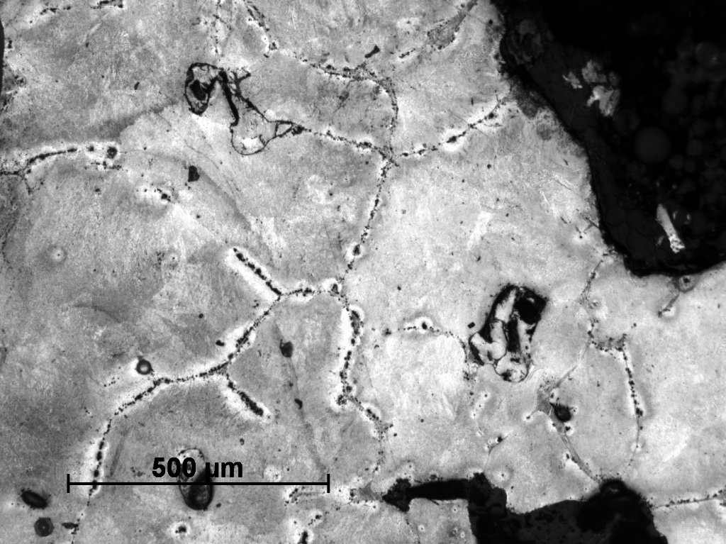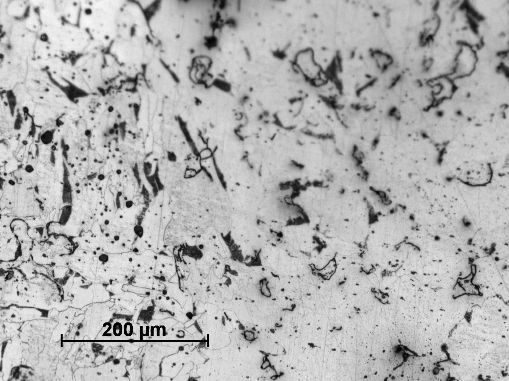 Sample Number 2.1 was taken from the lower part of 'bloom'. It consisted of a homogeneous structure of pearlitic grey cast iron with only minor ferritic educts, mostly on the grain boundaries (See Figure 26). In some areas the needle-shaped ferrite can be also observed (See Figure 27). The graphite flakes are long, relatively thin and slightly curved in some areas. They demonstrate an uneven distribution in metal. The second sample taken from the top of the 'bloom' and labelled as Number 2.2, has a similar structure, but with this difference that there are very large numbers of phosphide eutectic, which occurred in the whole element (See Figures 28-29). The last sample (Number 2.3) is characterized by pearlite-ferritic matrix and multitude of phosphide eutectic, similar to sample Number 2.2. Also the needle-shaped ferrite also occurs much more frequently than previously (See Figures 30-31).