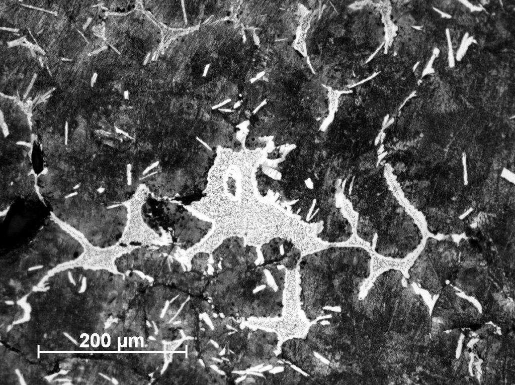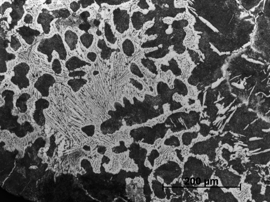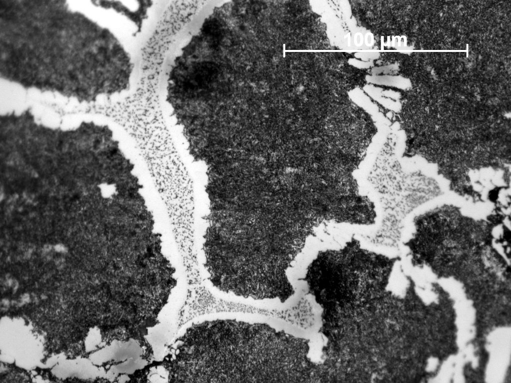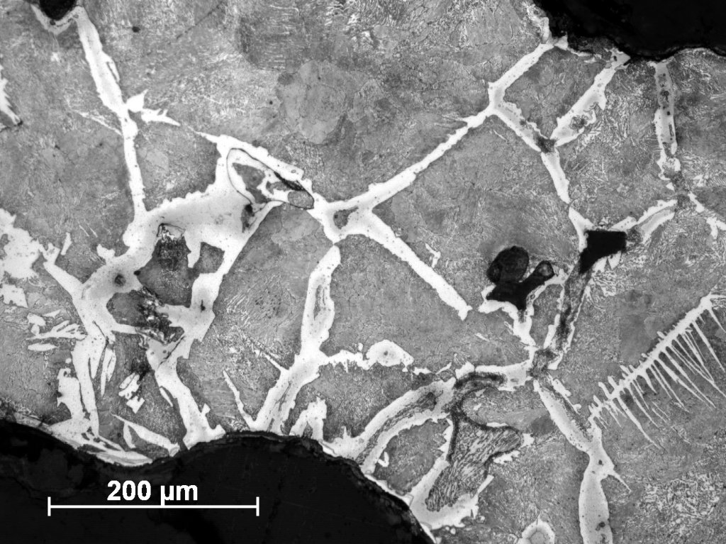 Sample Number 1.2 has a more heterogeneous structure. The dominating phase is pearlite, but in some parts a ferrite network can be observed on the pearlitic background (See Figure 20). Ferritic educts in Widmanstätten orientation are mostly located on the edges of the sample (See Figure 21). Moreover, similarly as in the sample Number 1.1 we can observe plenty of fusion spots with phosphide eutectic or ledeburite content (See Figure 22-24). A primary segregation of elements can be also observed in some ferrite educts (See Figure 23,25).