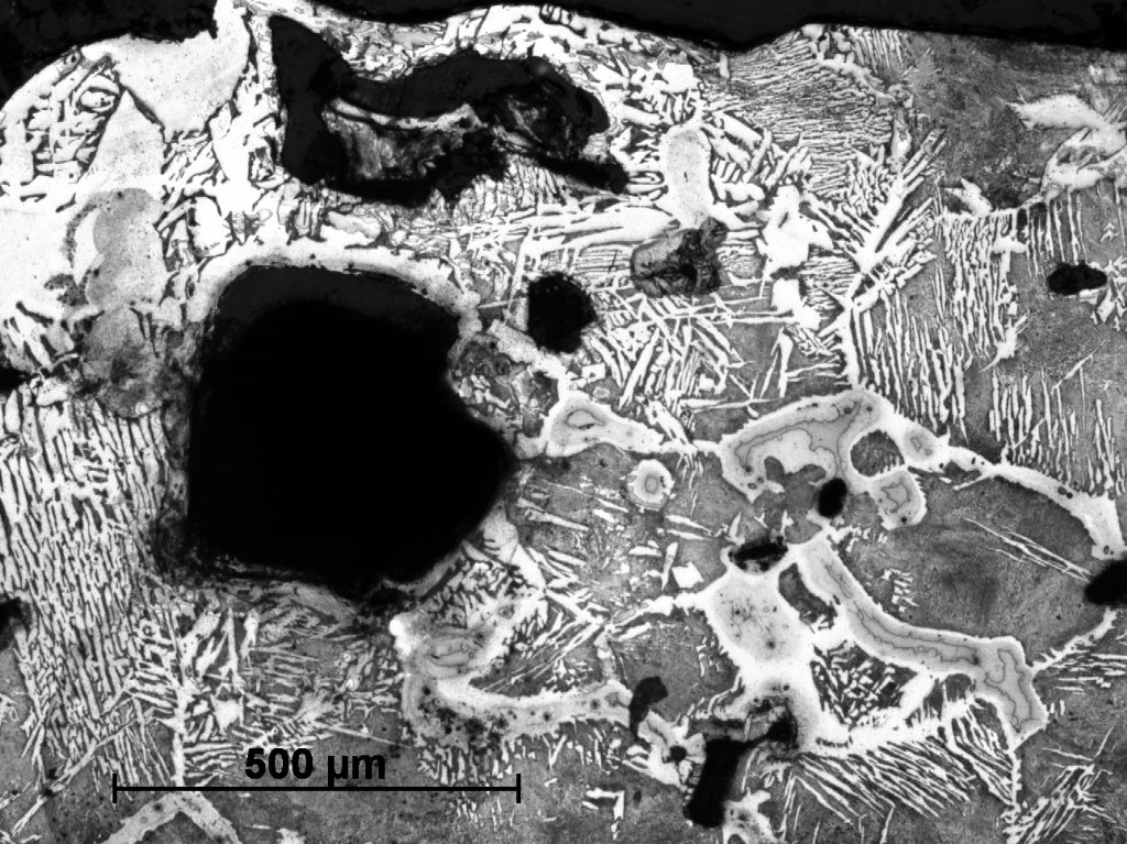 Sample Number 1.1 has a mostly homogeneous structure of pearlite with numerous oxide inclusions and many areas of transformed ledeburite (See Figure 14). Very few areas showed the local occurrence of ferrite-pearlitic structures usually associated with the fusion spots—perhaps caused by the presence of phosphide eutectic (See Figure 15). The fusion spots occur also in pearlitic areas (See Figures 16,18 and 19). They attracting carbon from adjacent spaces and creating a characteristic band on the grain boundaries. Besides, numerous fusions with ledeburite structure were observed on the whole cross-section of sample (See Figure 17).