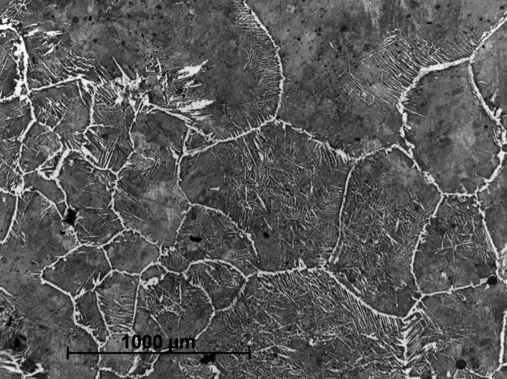The most recent studies performed on the products of the process presented above revealed interesting mechanisms of this phenomenon (Wrona 2012). The structure observed on the cross-sections of ingots allows for the conclusion that this high degree of carburization was made possible by the partial melting of the batch. Metallographic observations of the samples’ surfaces present a diversity of existing structures and reveal an uneven degree of carburization. The highest concentration of carbon observed on the cross-section (with content significantly exceeding 1.5%) was located in the inner parts and arranged in layers with alternating bands of predominantly ferritic structure (See Figures 1, 5-6). The occurrence of such high carburized areas inside the ingots, combined with a very short (a few-minutes) duration of the process testify to local partial melting and strong carburizing of charge that falls to the bottom of the furnace creating a multi-layered clot. This thesis seems to be confirmed by the hypoeutectic structure observed in the cross-section of sample (See Figures 1-3) and the Widmanstätten ferrite educts (See Figures 4,6), which can be explained by local melting and overheating of steel. The coexistence in the adjacent space of hypereutectoid structures points to a further intensive diffusion of carbon to the surrounding areas (See Figures 1,3,7). The accurate characterization of changes in the boundaries of the two-phase coexistence region of the liquid and austenite in the presence of the high dynamics of transitions caused by changing carbon content and periodic temperature variations is not possible at the present time and requires further research and verifications. In addition to that highly carburized zone, there are also areas of the virtually unchanged, ferrite-pearlitic structure of the starting material (See Figure 5).