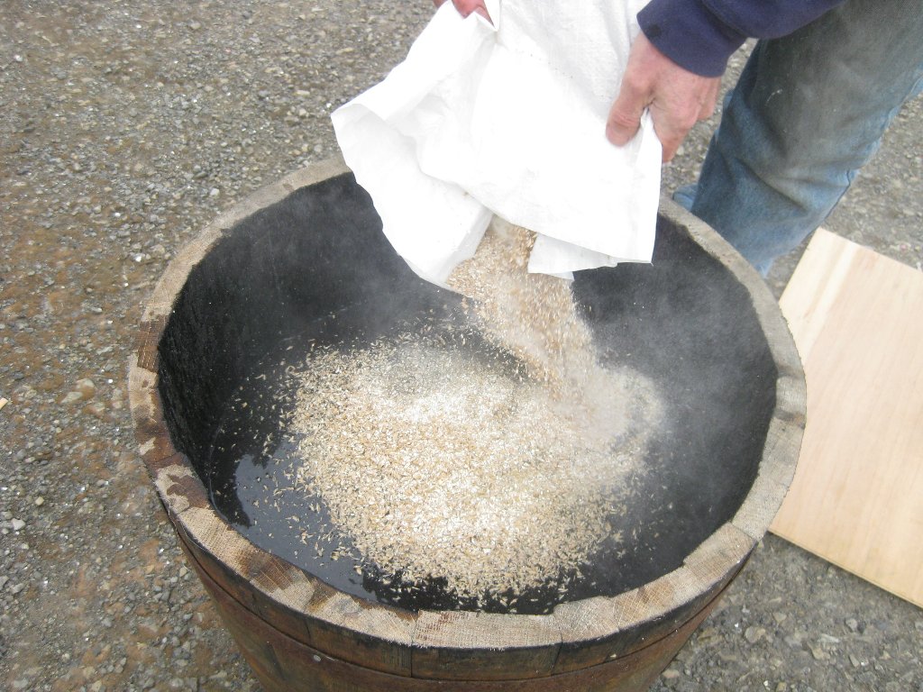 Malt contains very little sugar, but it does contain starch and the necessary enzymes (amylase) that convert starch into fermentable sugars. To make these, the malt is 'mashed'. The malt is crushed to break the husks, then mixed with hot water for about an hour in a mash tun (See Figure 7). It must not get too hot or too cold, about 65°C is perfect (Line 1998). Hot rocks are good at keeping the mash temperature up. As the mash cools, a hot rock or two will warm it up again.
