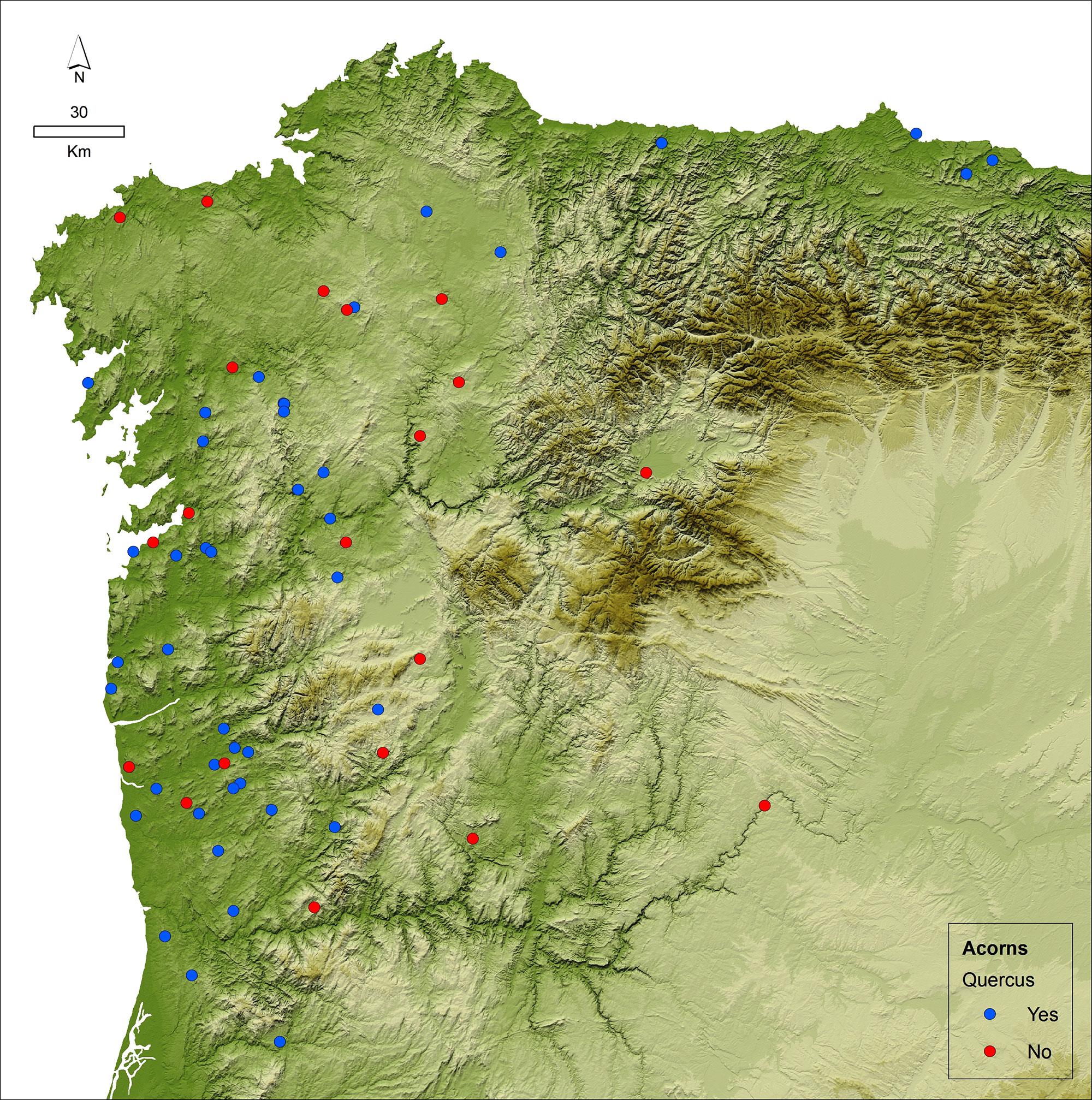 In addition to the considerable presence in carpological record, acorn remains have been found (starches and phytoliths) by microscopic analysis in mills and ceramic potsherds from sites like La Campa Torres in Gijón (Juan-Tresserras and Maya 2001), or Toralla in Vigo (Juan-Tresserras and Matamala 2003).