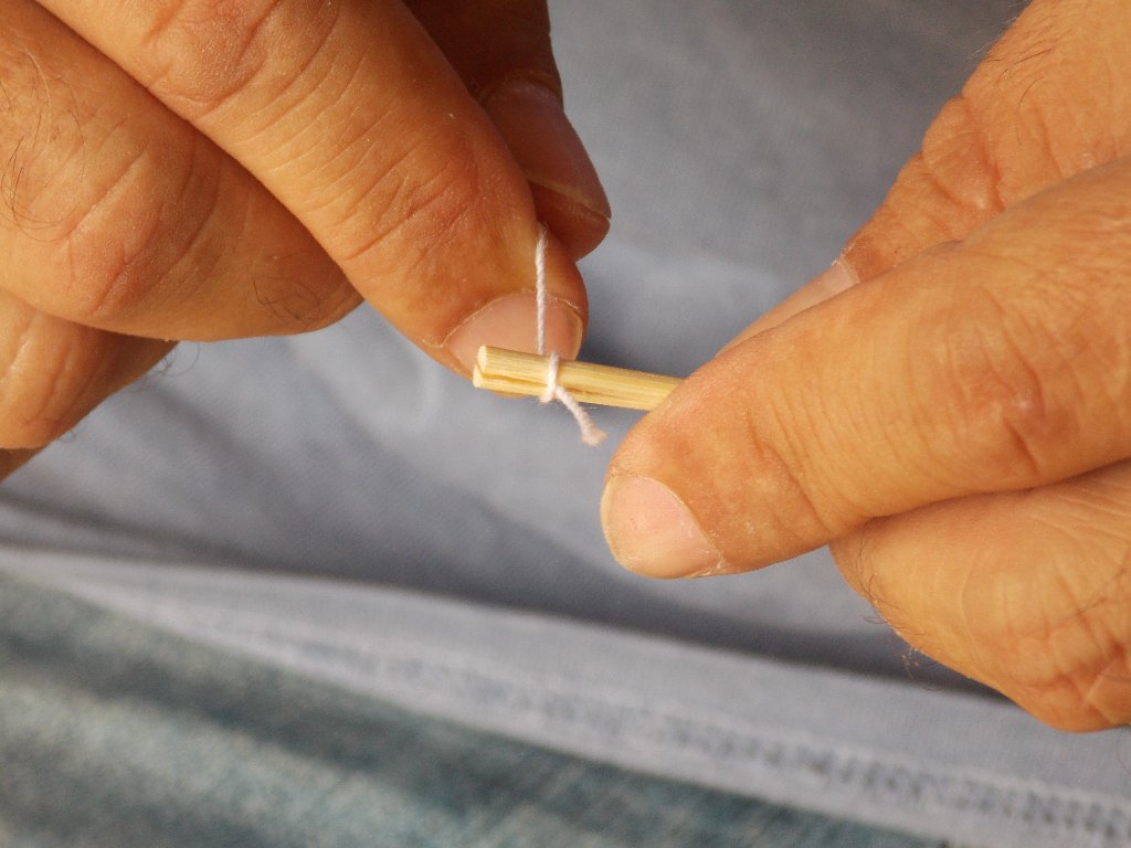 To roll a dart, keep hold of the thistle filament between your thumb and index finger and keep your other fingers flat. Pick up the shaft with the prepared string, wet the string and put the string in your mouth. For a right-handed person, you will hold the thistle in your left hand, the shaft in your right hand and the string in your mouth. I start the string about one eighth of an inch behind the end of the thistle at my thumb and twist the shaft clockwise. Your string should catch the thistle filament and hold it to the shaft. Slowly move the shaft to the left while the string attaches thistle filament to the shaft. The thistle will be placed on the shaft from the back toward the centre. You should keep tension on the string with your mouth.