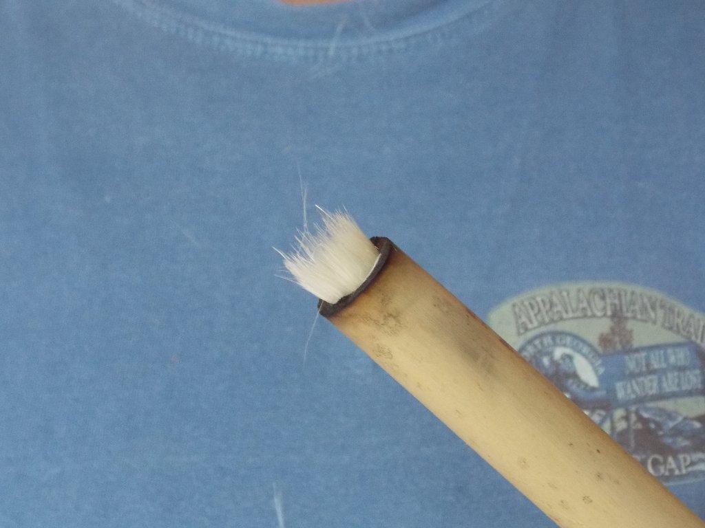 Over the years, I have learned that the actual rolling is a hard concept for some people to grasp. You are attempting to make a continuous spiral of thistle down and string along a three to five inch length of a dart shaft. People either move the shaft too fast or do not catch enough thistle filament on the dart. These darts either end up looking like plucked chickens or the filament is tightly packed in about an inch and one half of the back of the dart. Practice is the key. Once you realize the balance between shaft and material, you can tie darts using inferior materials.