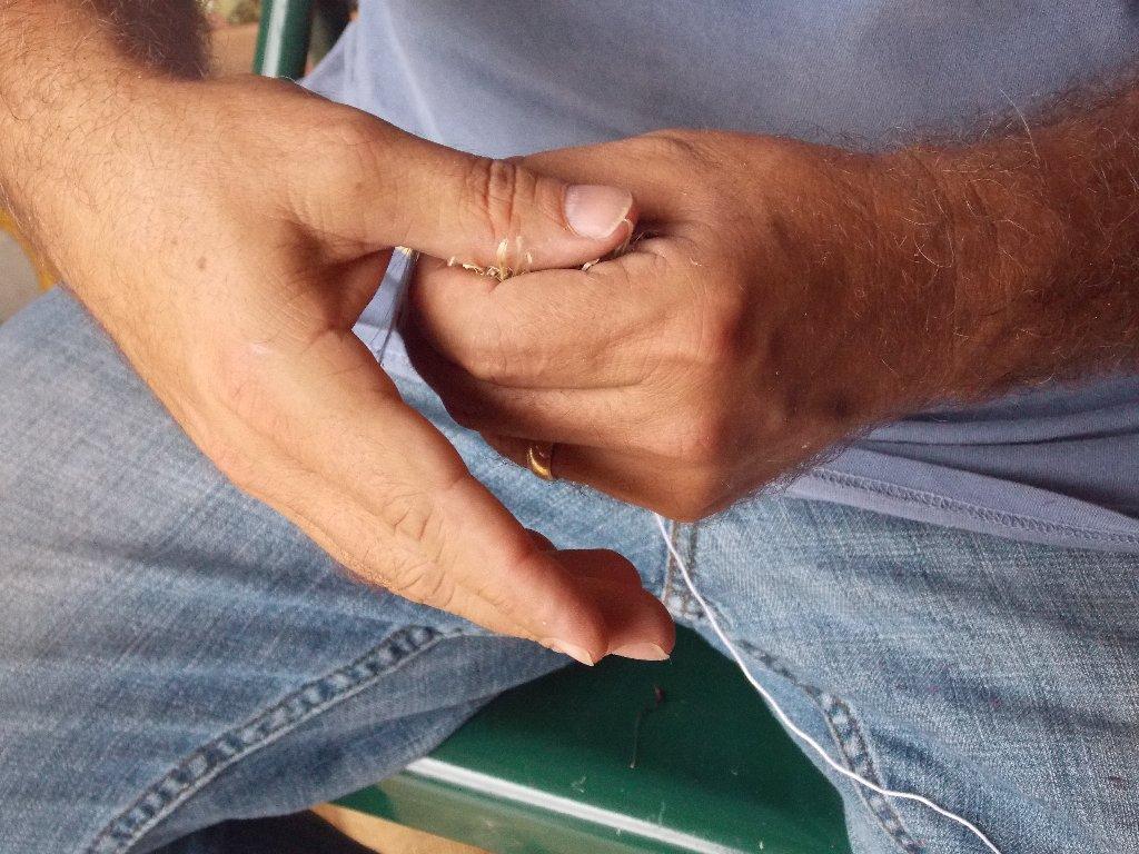 Now take your thumb or index finger and briskly rub it across the stamen circles to break them up and release the filament. This rubbing crushes the stamen circles and separates the filament to be used for rolling the dart. I usually squeeze the filament hard so my hand generates sweat. This moisture and compression briefly keeps the filament together so you can turn the filament around in your hand. You want the seed side of the filament facing your left palm so that it lies against the shaft when you are rolling the dart.