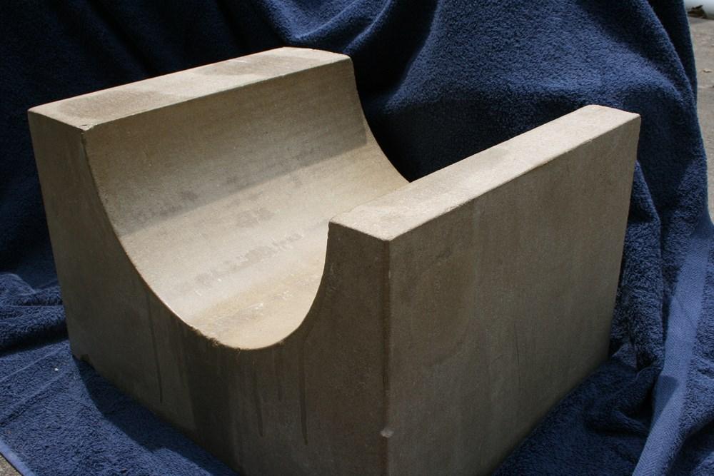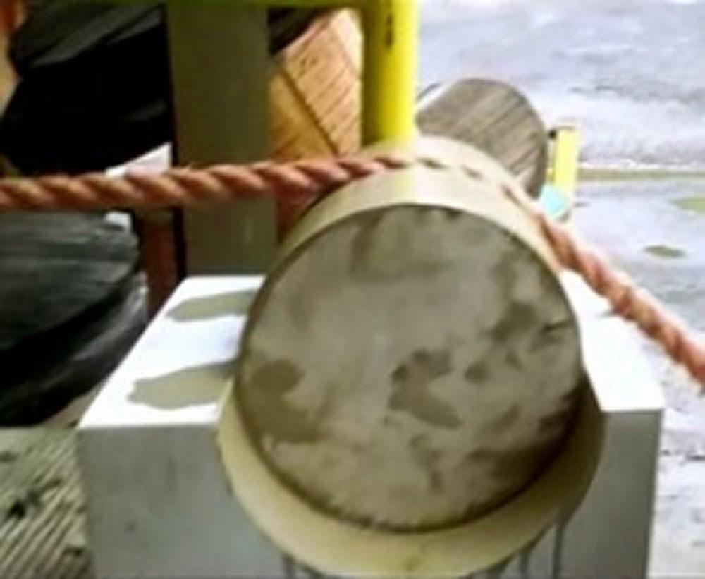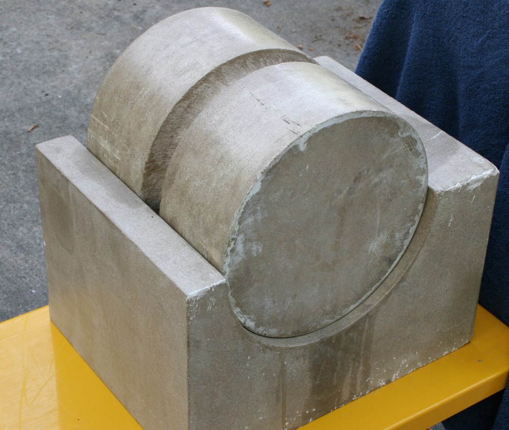 Indiana limestone, with quality similar to the Tura limestone Great Pyramid outer, finish stones (Romer 2007, 181), was selected as the material of construction for the pulley cylinder and cradle for both cost and availability reasons. Of the three plausible materials of construction, limestone, granite and copper, limestone exhibits the lowest compressive strength (Marks 1957, 5-6), significantly so. The full scale pulley cylinder diameter was 29.9 cm diameter and 30.5 cm long, weighed 48 kg with a mid-point circumferential, roughened groove to accept 3.8 cm diameter rope; the cradle had a (inside) diameter of 30.3 cm, was 35.6 cm long and weighed 95 kg with an angular span of almost 180 degrees (See Figure 5). Manila rope, 3.8 cm diameter, with a minimum breaking strength of 8,391 kg (Marks 1957, 6-175) was utilised as the pull rope. Natural resin (shellac) was used to seal the mating surfaces of the cylinder and cradle. Olive oil was used as the lubricant.