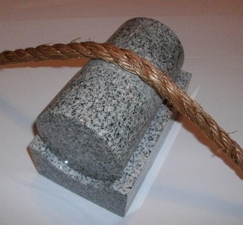 Based on elementary stress analysis, a prototype Egyptian pulley was designed and fabricated from granite, with the goal of demonstrating its function as a pulley (See Figure 4). The prototype Pulley had a cylinder diameter of 10.2 cm and an axial length of 18.0 cm; the cradle had a (inside) diameter of 10.3 cm, a length of 20.5 cm, with an angular span of 120 degrees; the combined weight was 7.0 kg. The mating cylinder-cradle surfaces were polished and lubricated with a thin film of rendered animal fat during the tests.Manila (plant fiber) rope, 3.8 cm in diameter, was selected as the pull rope.