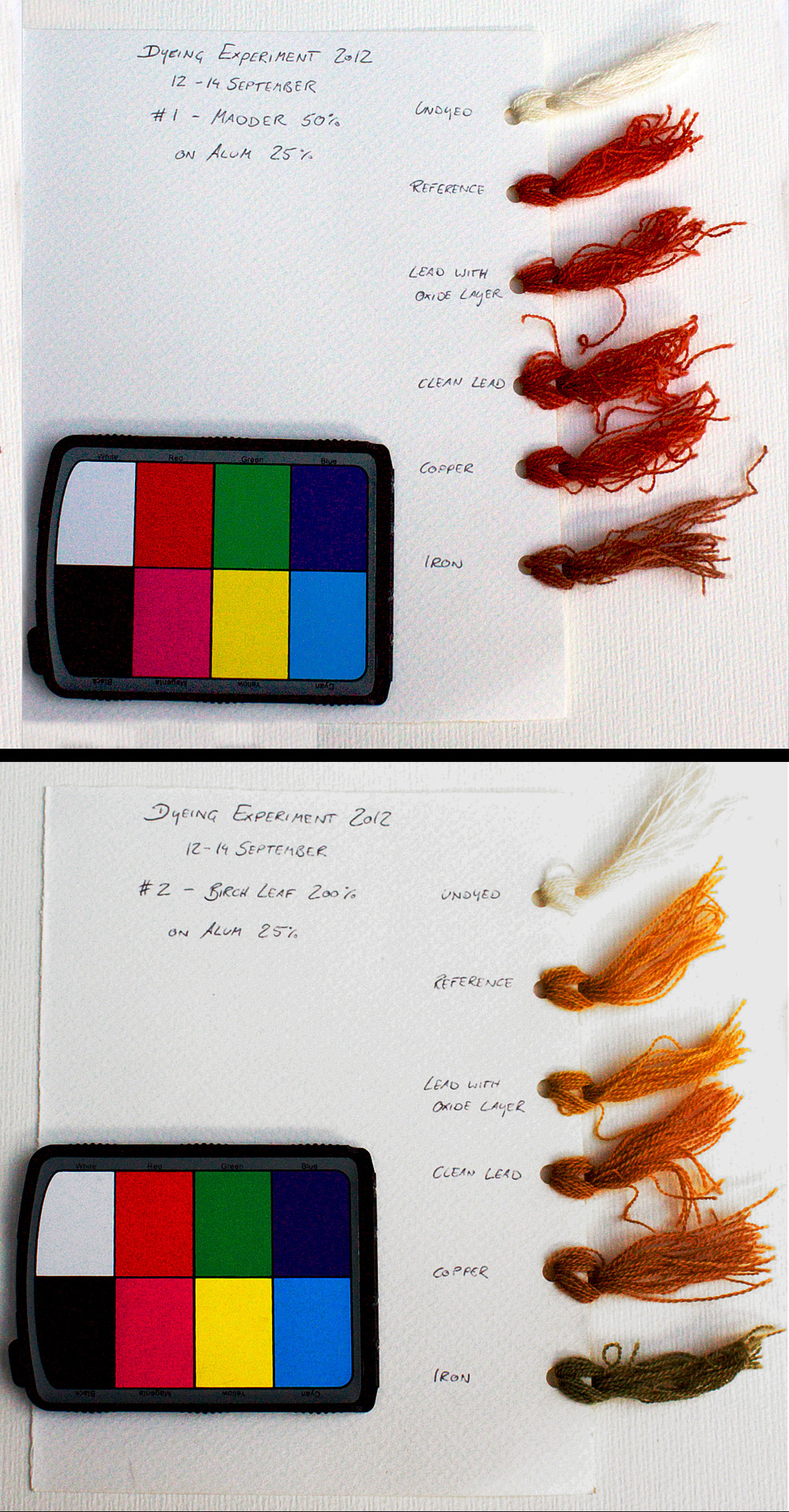 Regarding the dyeing process in different material vessels, however, further questions can be explored: is it the metal kettle wall that directly affects the colour, or does the metal merely procure the change in pH that, in turn, affects the colour? Does this influence on the colour happen during mordanting, during dyeing, or equally during both parts of the process? Does the kettle wall also have an influence on the stability of the colour, such as its lightfastness?