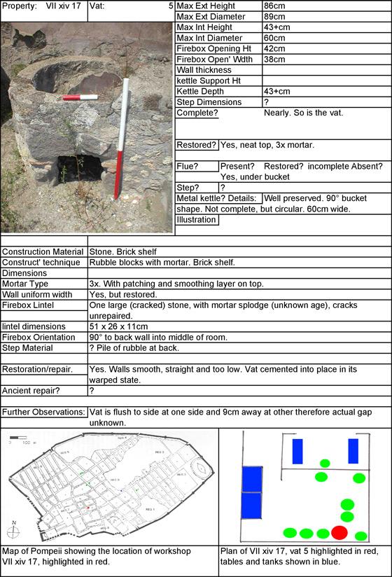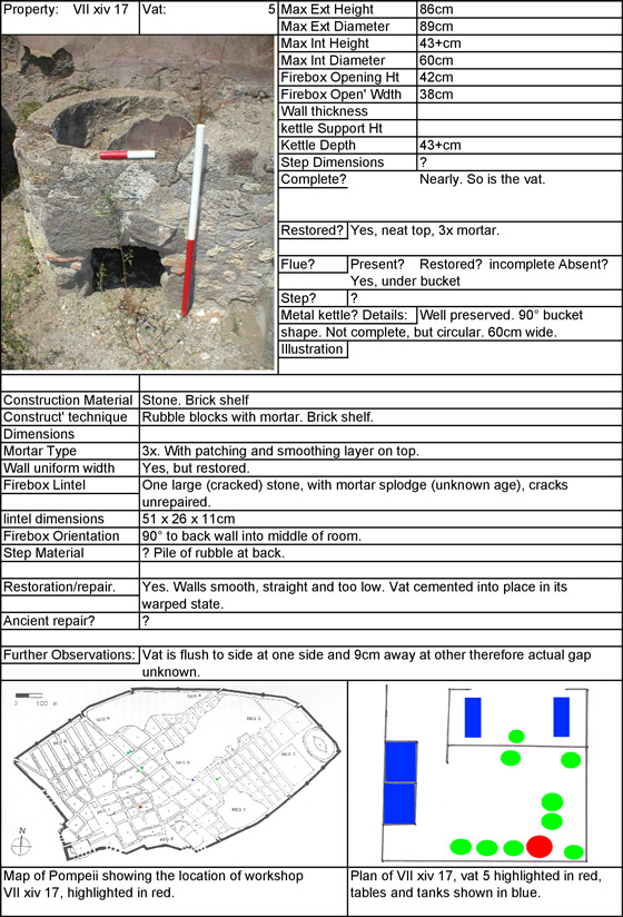 Dyeing, especially in bright, intense colours, has been one of the methods used to embellish textiles and add to their value. A considerable dyeing industry can be shown to have existed in Pompeii. The city of Pompeii was destroyed in a volcanic eruption in AD 79, but its remains were preserved in situ (after Allison 1992). This includes six dyeing workshops (Moeller 1976). The six workshops, together contained between them, forty apparatus consisting of a kettle in a brick or rubble and mortar surround to house a fire for heating the kettle (A survey was undertaken in 1994; Robinson and Janaway, unpublished). The kettles were supported by a ring of material which their bottom edge rested on; thereby leaving most of the kettle bottom unsupported. The dyeing apparatus were extensively researched by Hopkins (2007, 2008) to gain a better understanding of the scale of industry.