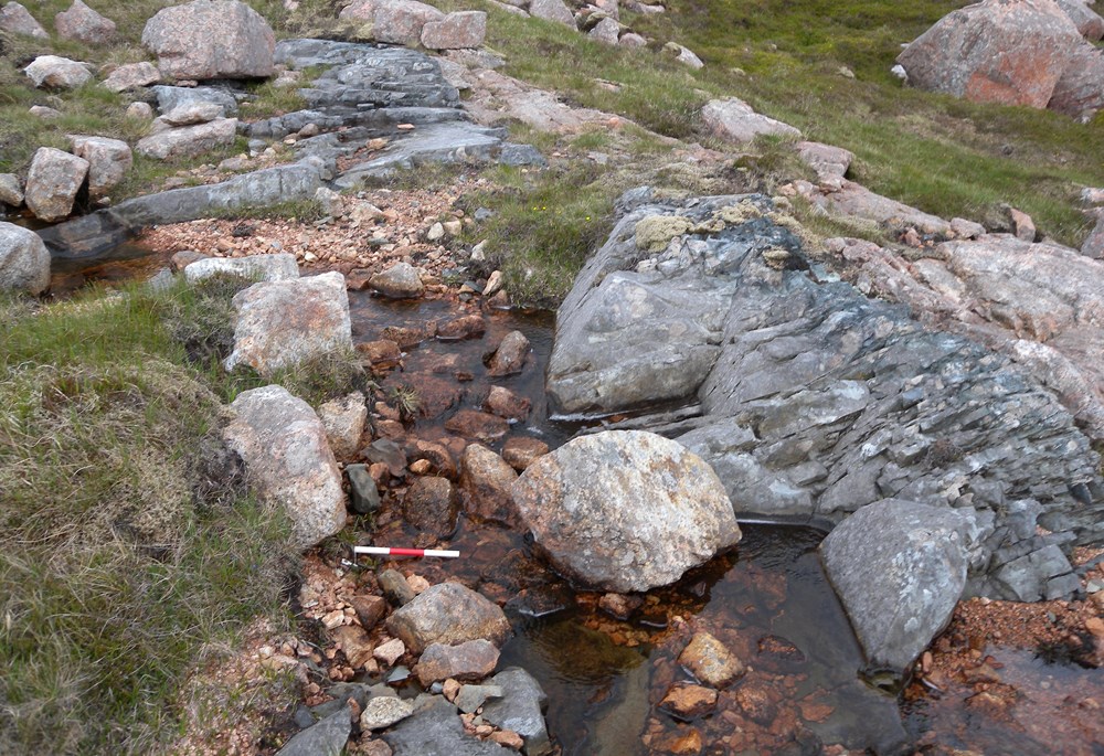 The second factor is an apparent leaching of minerals and subsequent weakening of the rock. Since the Neolithic period the area of North Roe has become covered in bog, resulting in a consequential build-up of humic acid. It is believed that this is having an effect on the stone on the ground, discolouring all stone including felsite. Indeed, initial results from portable x-ray fluorescence (PXRF) field testing have suggested that the effected felsite possessed less iron and potassium, which is consistent with organic acid leaching.