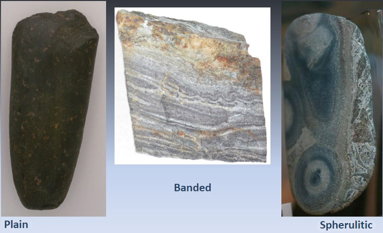 Visually, finished felsite knives and axes, as well as raw unworked felsite, can vary considerably. Simply, felsite can be divided into plain, banded and Spherulitic, this last type apparently being preferred for knife production over axe (See Figure 2).