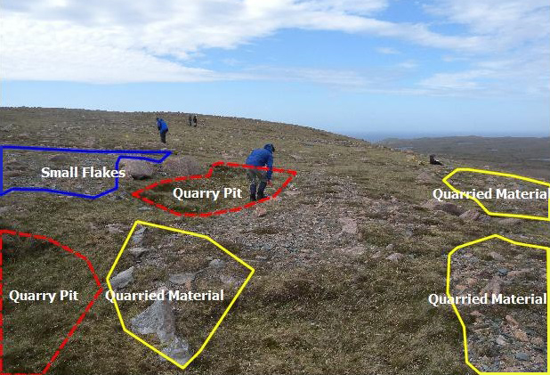 On the ground today quarry sites are typically identified by pits,representing the absences of an in situ dyke, which are surrounded by large amounts of broken and worked stone. At these sites there is evidence for different stages in the procurement and production sequence, including removal of "intact rock"(McGreevy and Whalley 1985, 338), removal of workable material from larger stones and the initial roughing out and deposition of broken attempts. From 2009 to 2012 small scale reconnaissance surveys were conducted in order to identify key sites in the North Roe area (Ballin 2011a; Ballin 2011b). One such site, known as Grut Wells (See Figure 3), has a series of quarries along the course of a single dyke with associated material scatterand was the focus of an intensive field survey in 2013. Running north/south along the dyke, the quarries are situated near the top of an east facing slope (See Figure 4) with large pieces of apparently worked stone scattered downslope to the east. To the west of the dyke, on a flatter part of the hill there are large amounts of small, finer worked flakes, possibly the remnants of individual knapping episodes. However, as the teams began the field survey, this once clear impression began to blur.