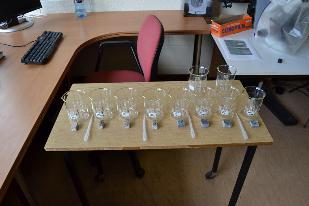 To this end, an experiment was designed that would subject different types of felsite (plain, banded and spherulitic) to an accelerated organic acidic reaction. The felsite samples were each cut into four similarly proportioned pieces. This provided enough material to run leaching tests on polished, unpolished and cleaned specimens while exposing a fourth sample to ordinary tap water as a neutral Ph control (See Figure 7). All sides of each sample were photographed and detailed notes were taken on the process before the samples were placed into individual beakers and half submerged in acetic acid (See Figure 8). Additionally, each leaching specimen had a corresponding control sample of either acetic acid or water to act as a control against which any later solutions can be compared.