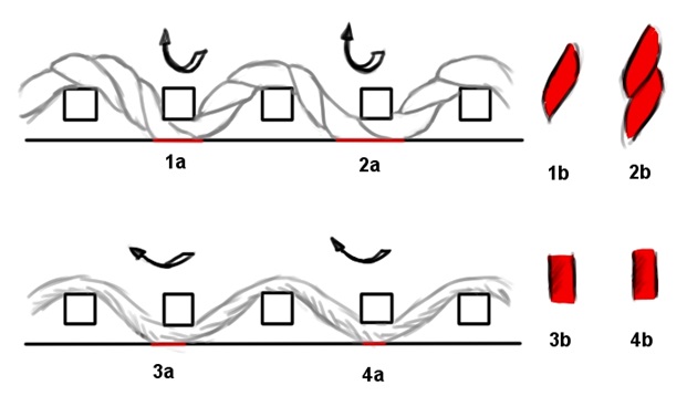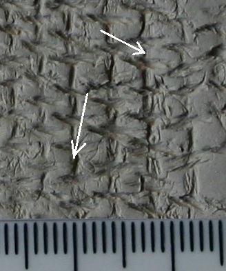 This slant is formed when only the part of the weft thread that passes in front of the warp is imprinted onto the clay. The twist on the plied yarn means only one side of the weft thread is pressed into the clay, and this leaves a gap where the rest of the weft continues to twist up and run behind the next warp thread. Should a plied fabric be pressed firmly into wet clay, this gap may not appear; however, these conditions should leave suitably deep impressions to observe the full plied nature of the fabric. In comparison, single-spun threads do not leave this impression, since they have less width to move behind the warp threads and lack the twist found in plied yarns. Instead, they produce a single impression that simply follows the line of the weaving. As only flax was plied in pre-Iron Age periods, this could indicate which impressions were made from flax or woollen fabrics (Rast-Eicher, 2012, 380 and 384).