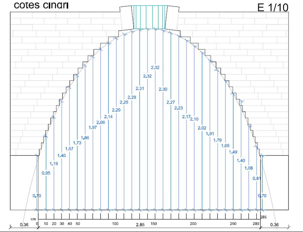 Based on these arguments, a study was commissioned to the architect Antoni Martí Falip to assess the feasibility of an upper firing chamber with a corbel arch brick superstructure (false dome) with adobe bricks equal in size to those of the Iberian Culture. The results of Martí Falip's report (Martí, 2011), contrary to the engineering report previously advanced by Broncano and Coll (1988) and based onthe criterion of the thickness of the wall of the Alcalá del Júcar kiln, has led us to envision the possibility that the firing chamber was capped by a corbeled false dome cover (See Figure 13).