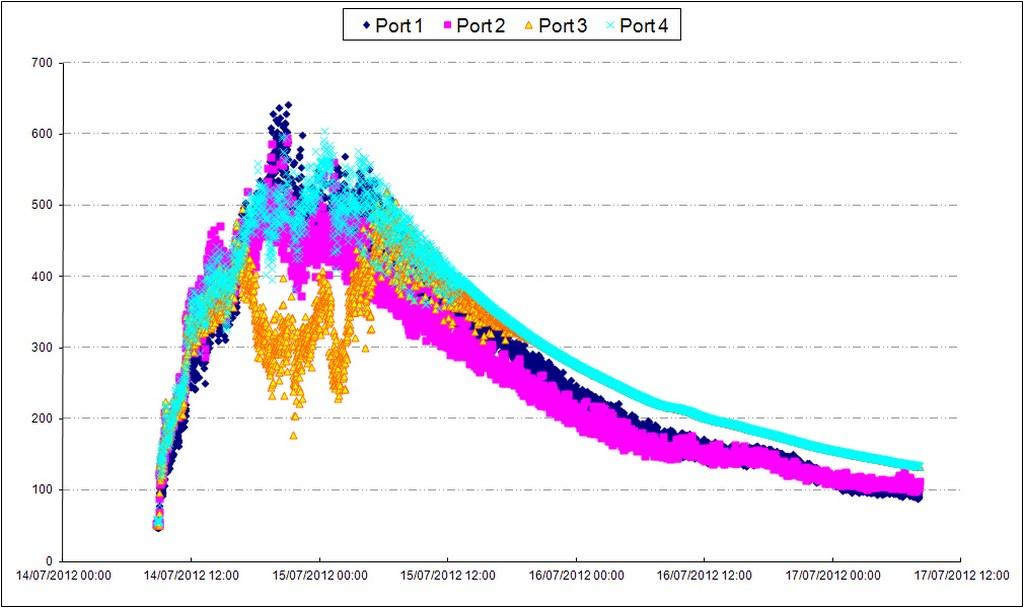 The kiln remained sealed until the 21st of July. The first photographs of its content were taken through its chimney. The grate had hardened considerably and the interior of the kiln appeared in good condition. Only some zones near the door needed slight repair. Pyrometric data from the sensors in the firing chamber indicated a peak temperature of 600° C (See Figure 18). No data, however, was collected in the lower chamber. In any case, the maximum temperature never exceeded 600° C, a fact attributed both to the large volume of the chambers and that it was fired without vessels. This phase of the experimentation, in fact, did not pretend to achieve more than a first consolidation of the grate and other delicate features, and assess the kiln's general resistance.