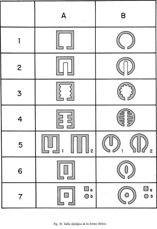 The classification by Broncano and Coll (See Figure 6), following the work of Duhamel (1978-79), is based on the layout of the combustion chambers, the section of the grate and the shape of the adobe bricks.The work served to establish parallels with other circular kilns in the Iberian Peninsula, notably the B6 subtype found at the following sites: Cerro de los Infantes (Pinos Puente, Granada) (Contreras et al. 1983), Cerro Macareno (La Rinconada, Seville) (Chasco and Oliva 1979), and Pajar de Artillo. (Santiponce, Seville) (Luzón 1973).