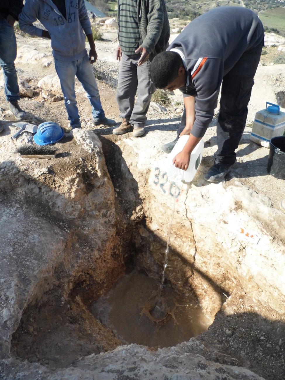 Day 2: The workers continued to create the rounded shaft, excavating in the hard Nari layers and cleaning the waste for circa eight hours. The workers commented that the hardest task was to carve the rounded shape of the shaft and to make a straight vertical wall for the shaft. By the end of this day, the shaft was filled with 40 l of water that were aimed to soften the rock and to make carving easier on the next day. The workers had advanced 20 cm below the previous level.