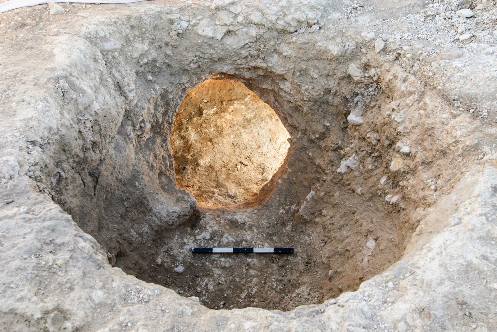 Day 5: This day, a new method was employed by the workers. They used iron pegs that were nailed into the shaft’s bottom and then removed (in antiquity, large flint objects or bronze pegs could have been employed, though we have no evidence for this activity). Water was then poured inside the holes. Workers reported that this method was more effective; the water that penetrated deeper into the rock layers softened it and made work easier. Nineteen centimetres of bedrock were carved and the shaft completed, as the soft chalk (Kirton) layer was revealed under the hard Nari.