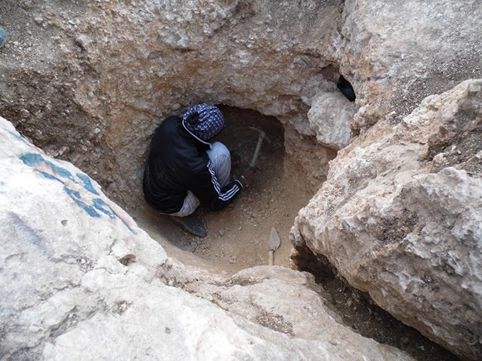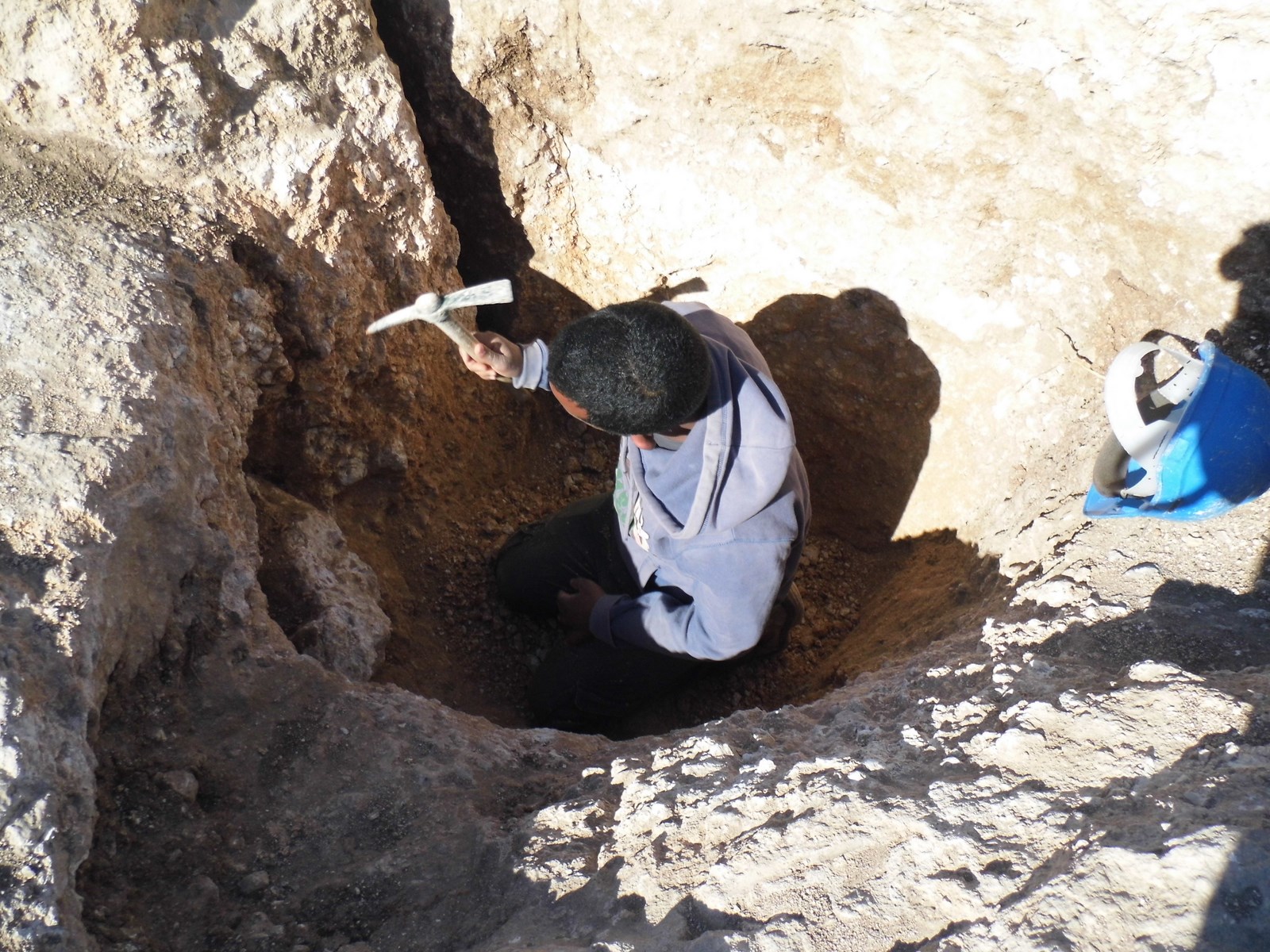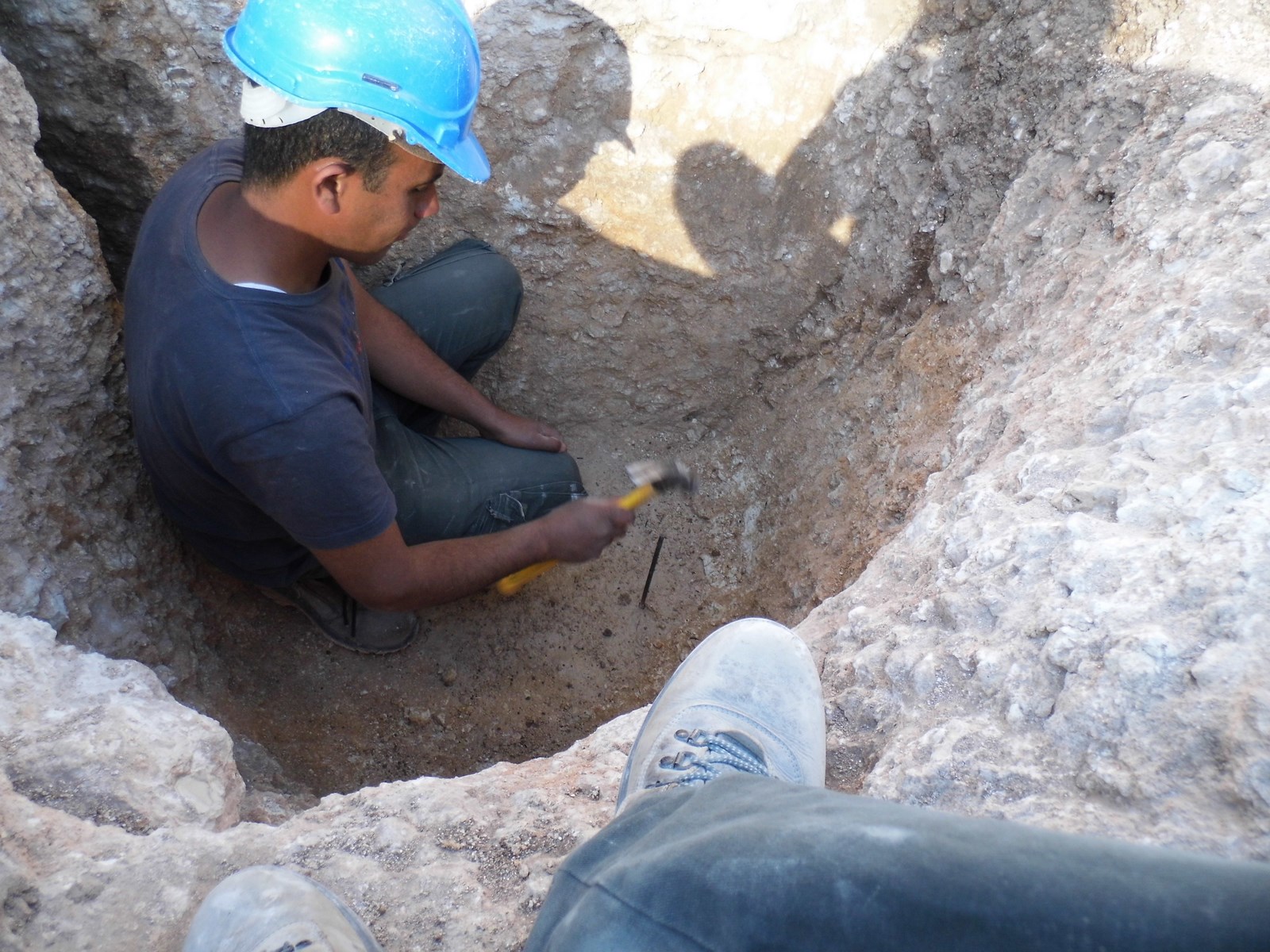 Day 1: The starting point for the carving of the shaft was chosen, a cavity full of erosion soil and small stones in the Nari layer. The first activity was to clean the cavity of soil and stones and to prepare the point for the shaft carving. This work took circa two hours, after which the rounded shape of the shaft was found to be ½ m in diameter. The carving of the shaft was conducted by one worker, using a large pick-axe. The other two workers cleared the waste. The workers changed their roles from time to time due to physical reasons; the hard work of carving in the hard Nari layer and the narrow space within the created shaft. In the two hours of work, only 0.30 m of rock were carved.