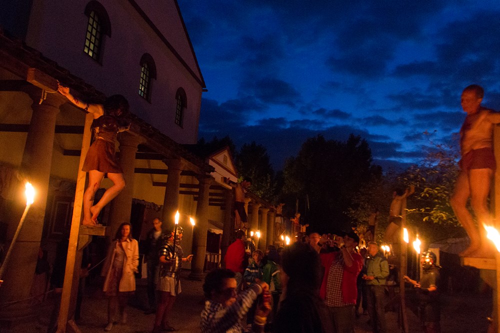 The performance was to begin at dusk and end in the dark of night; the scene to be lit by naked flame. This was to use the torch-lit murk as an atmospheric backdrop for a story we knew would end badly for the gladiators. (Crassus, the general who finally defeated Spartacus, had nearly 6,000 captives crucified along the Appian Way.)