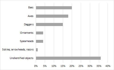 Concerning the visible archaeological record, a large number of stone moulds have been found on Terramare sites since the 19th century (for a catalogue, see Le Fèvre-Lehöerff 1992). They were used to produce a wide range of bronze objects, such as ornaments, weapons and tools, but the most represented items are bars, axes and daggers (See Figure 1).