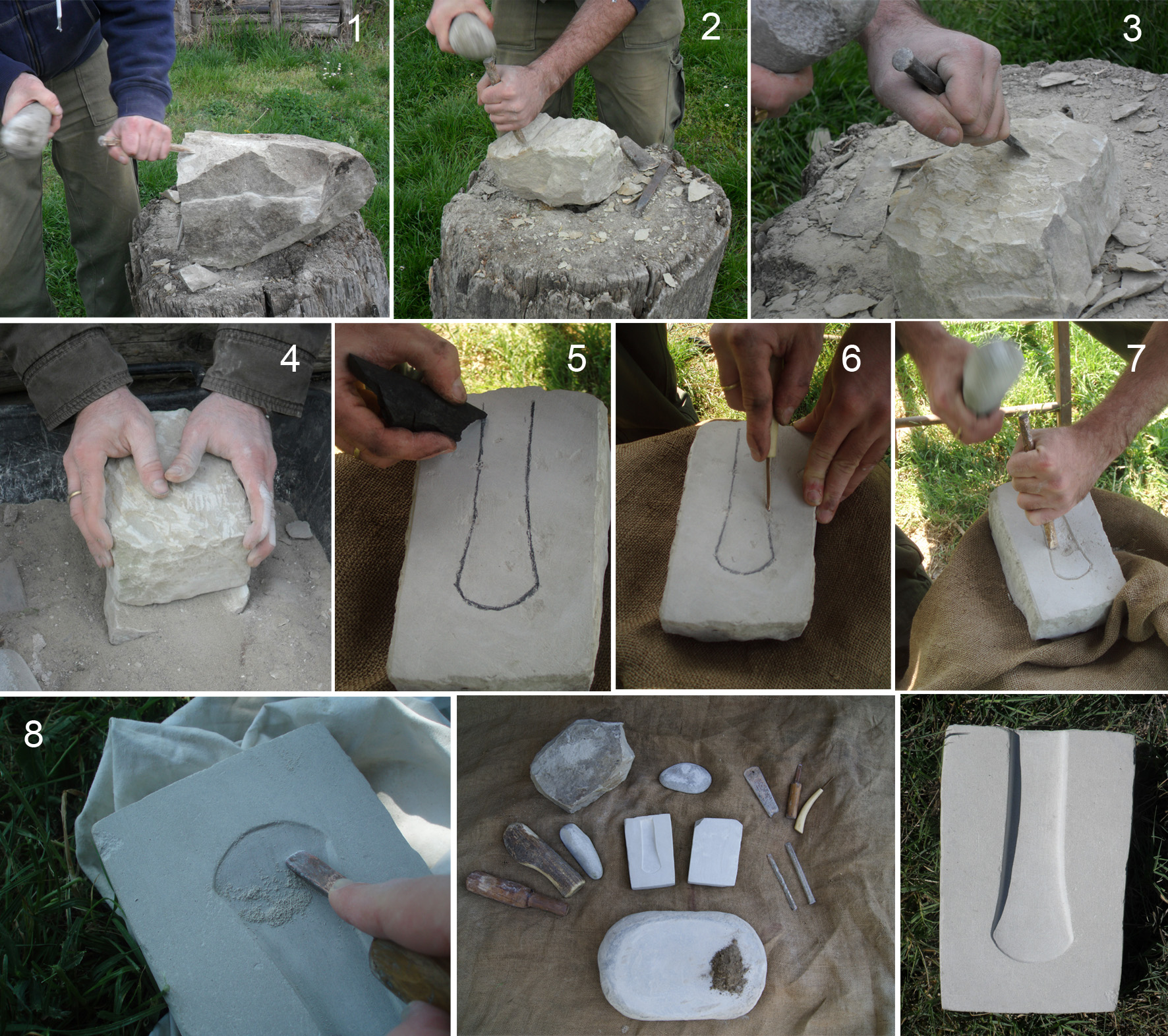- Forming two regular parallelepipeds quite uniform in size with a stone hammer (a river cobble) and a bronze chisel (12% tin). This work requires the greatest care because of the risk of fractures. To reduce the risk of fractures to a minimum, the previous remarks from stone-cut experts (especially points 1 and 2) proved to be very efficient. The majority of waste product was produced in this phase.