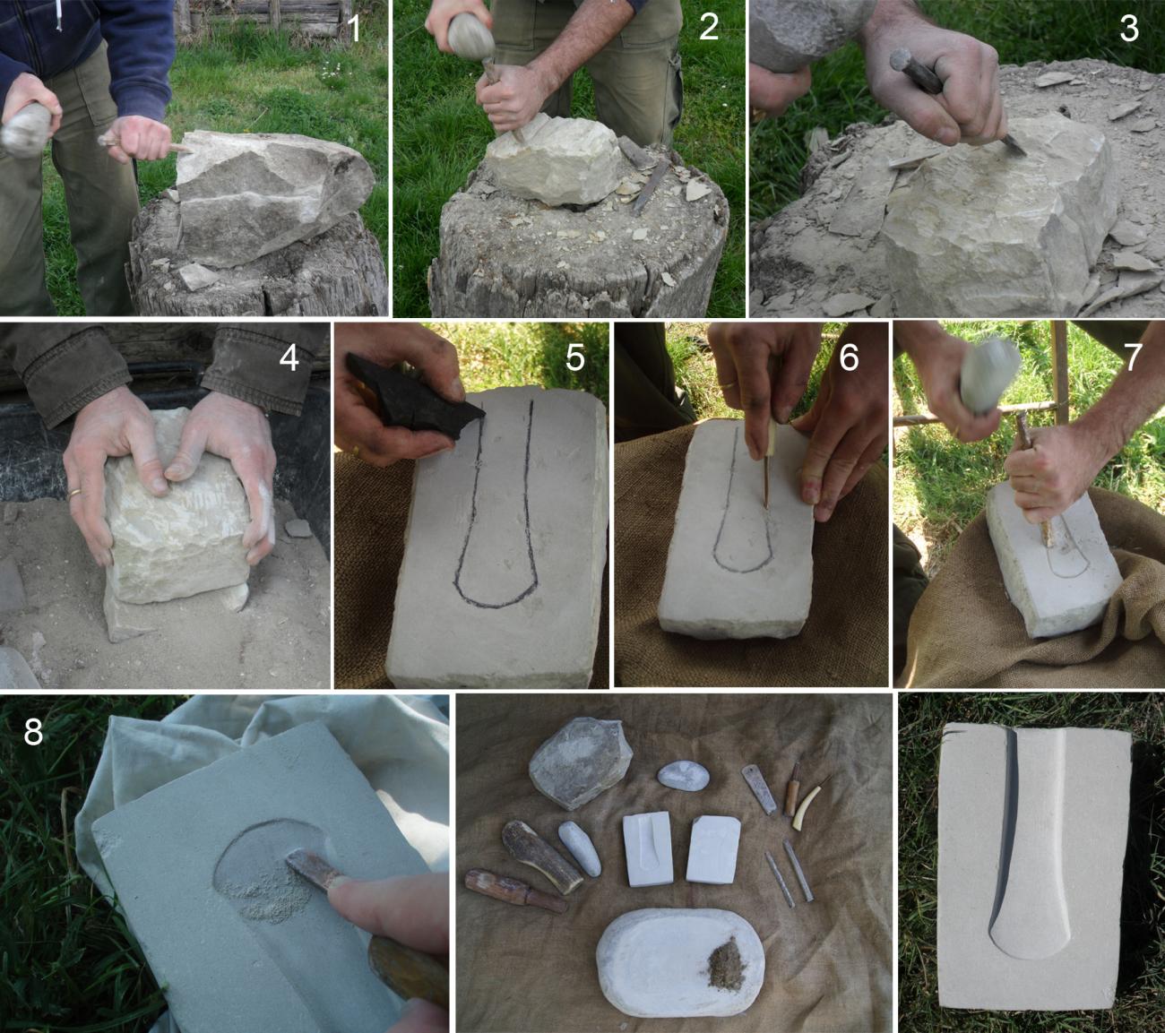 The low skill-degree required for the production of biocalcarenite moulds for axes, however, is not a sufficient proof that it commonly took place at a household level and/or led by non-specialised artisans. We have to consider that our basic level technical experience in stone working is balanced by a deeper scientific (and empiric) knowledge of lithology, petrography, material physics, topography and geological resources.