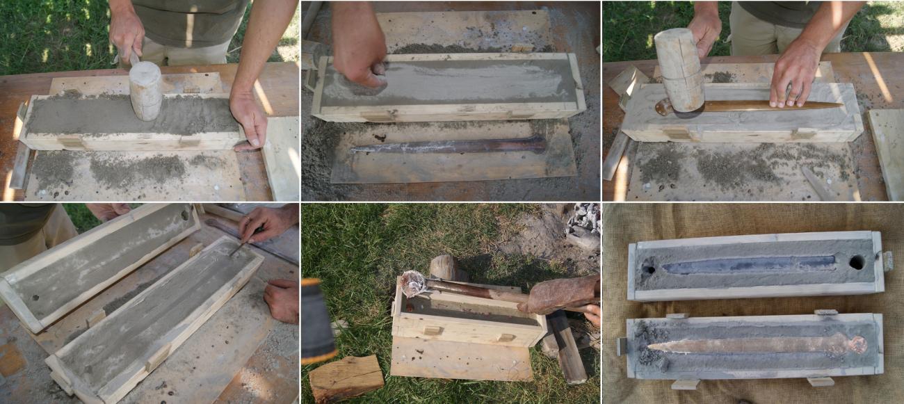 Firstly, we produced two wooden clamps and collected calcareous fine sand. The sand should be mixed with some water in order to make it more coherent. Then, the wet sand was pressed in the base clamp with a wooden mallet. A thin layer of dry sand, covering the filling, allows a better re-opening of the valves. After this preparation, a model of the sword was pressed in the sand of the base clamp, and subsequently the upper clamp was put on the lower one and filled again with sand, leaving a hole for casting channel. Finally, the model of the sword was removed, and the clamps were closed again (See Figure 4).