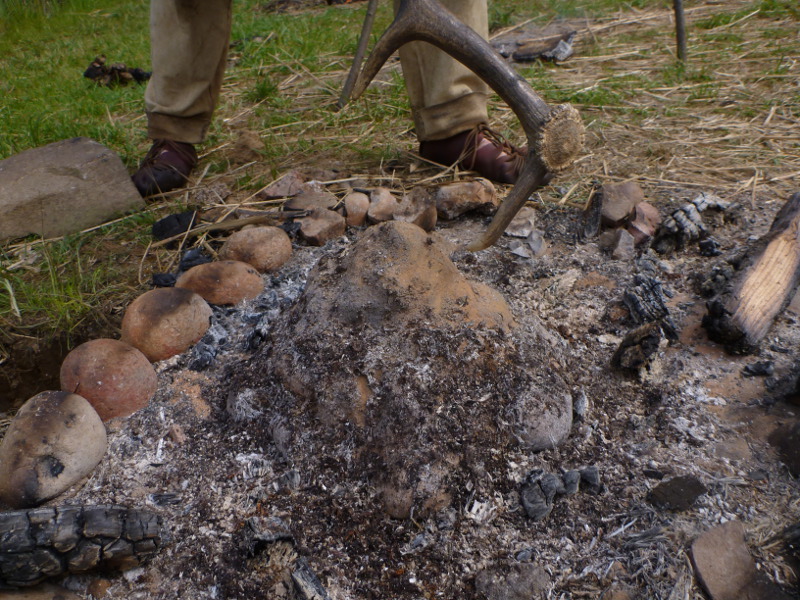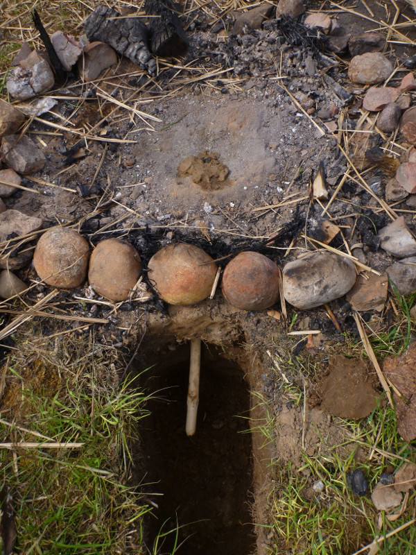 On top of this a big, hot fire, was made, which he fired for about 2 to 3 hours. After letting the fire burn down, the pit was allowed to cool down for at least one hour, sometimes much more, to prevent the heat inside creating a fire when coming in contact with oxygen.