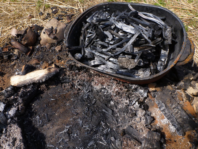 After stopping firing the fire burnt down to ashes and let the oven cool down for half an hour. When breaking open the oven it was noted that, in general, all bark had turned into charcoal.