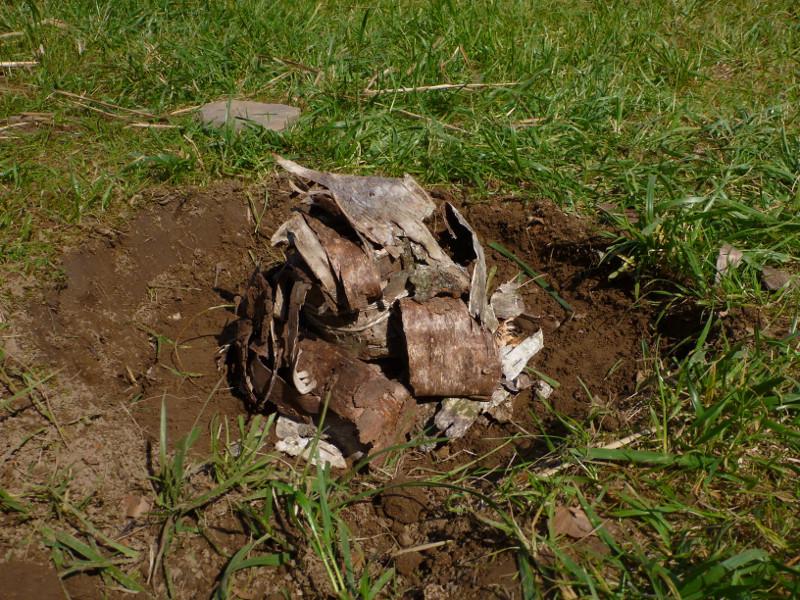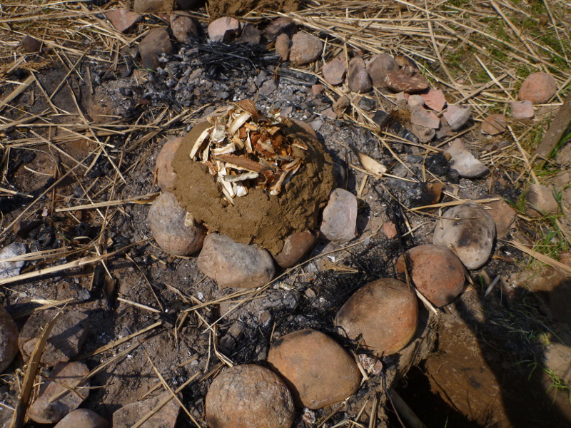 Birch bark was placed on top of the deck stone and a bit around it in a thick layer. To stabilise the bark, the space between the bark and the sides of the pit was filled with dry grass and little twigs. Then everything was covered with a layer of dry grass and twigs, filling the entire pit up to ground level. A thin layer of sand was put on top, then an approximately 2 cm thick layer of clay, mud and sand mixture to seal the whole pit completely.