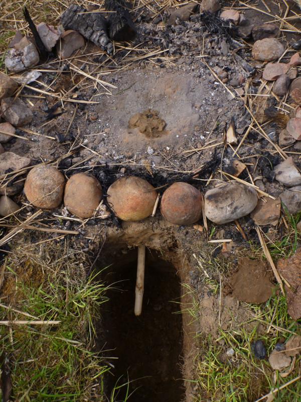 Small stones were set as little pillars around the vessel, about 3 cm high, to carry a small deck stone. The deepest point of the deck stone pointed to the centre of the vessel to let the tar drip into it. There was a space of about 3 - 4 cm between the stone pillars for the tar to find its way into the relative cooler room below the deck stone during the firing process.