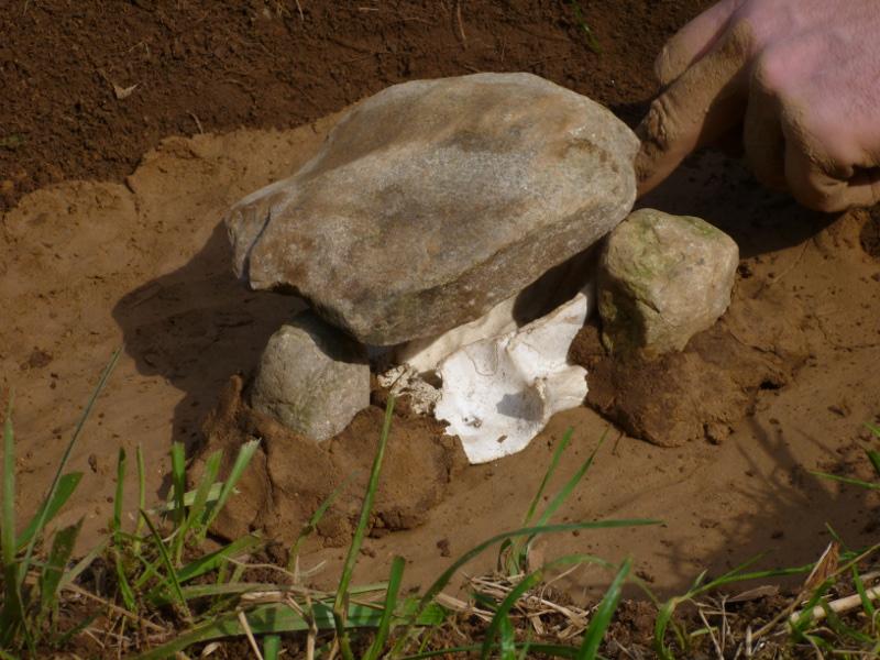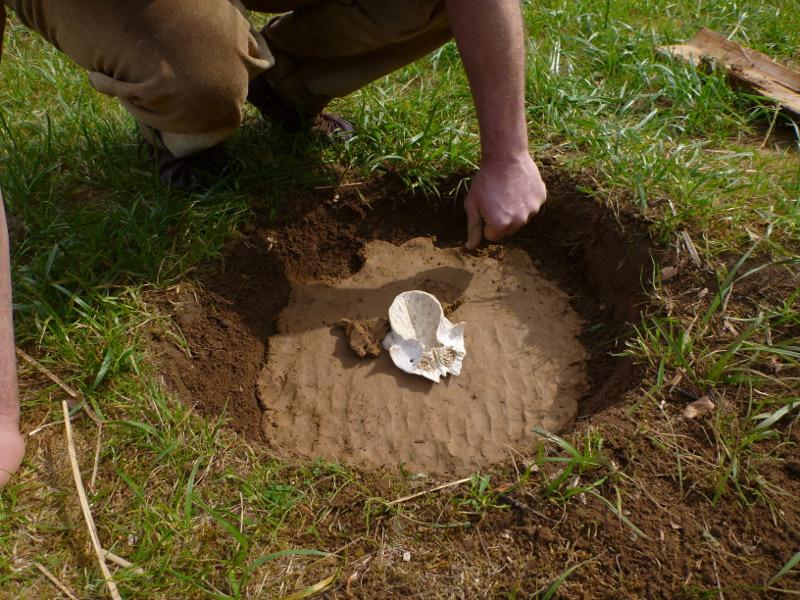 Marco dug a shallow pit in the ground, about 30 cm deep and about 60 cm in diameter. In the centre he dug a little groove for the vessel. The vessel was either a little clay pot, a can, or in one case a cut open part of a deer skull. The latter was used to see if a skull is useful to collect tar and even produce pitch with it, as clay pots and cans were most likely not invented yet during most of the hunter gatherer periods. Then the bottom and the sides of the pit were smeared with wet clay to prevent tar disappearing into the ground.