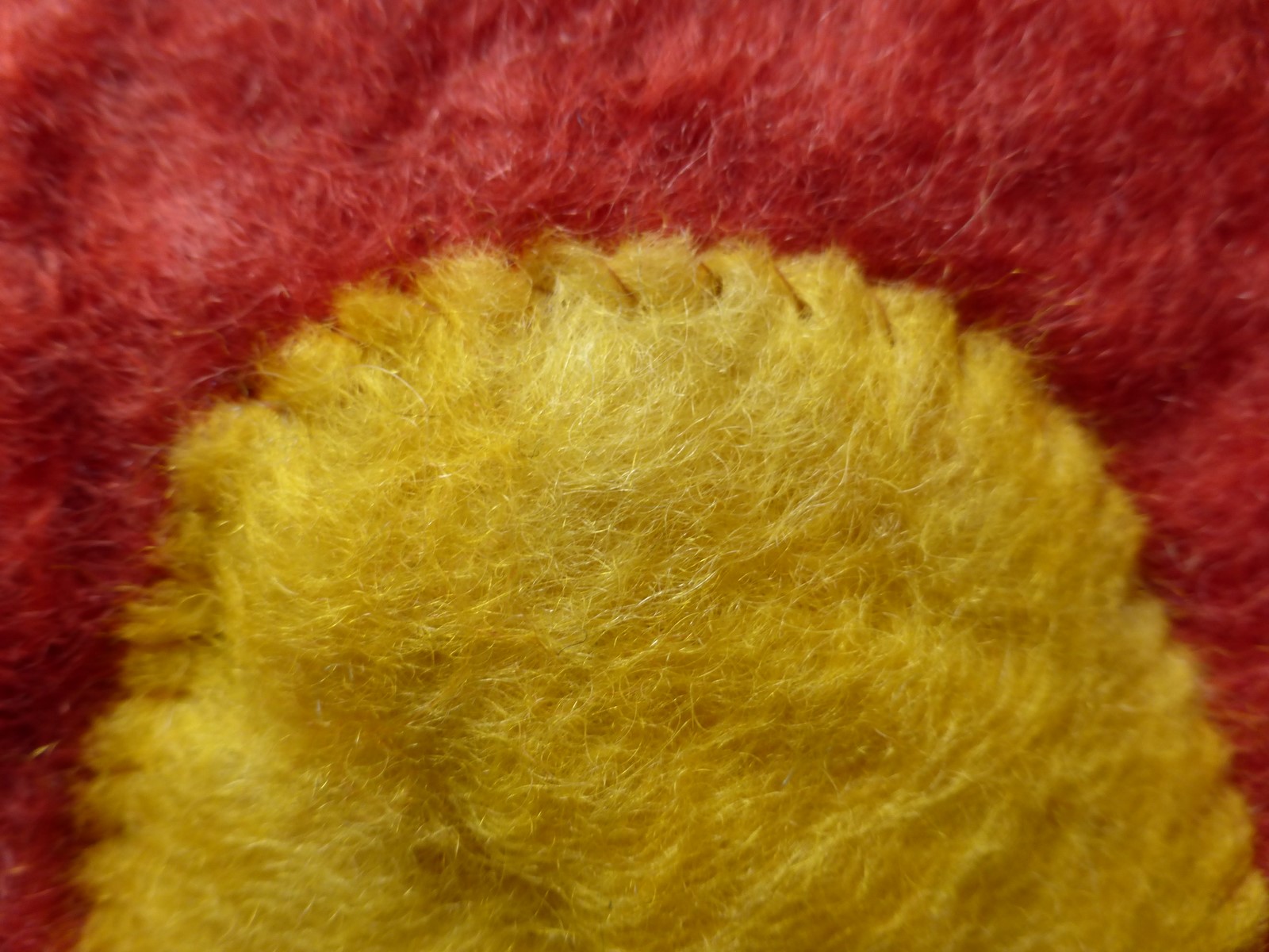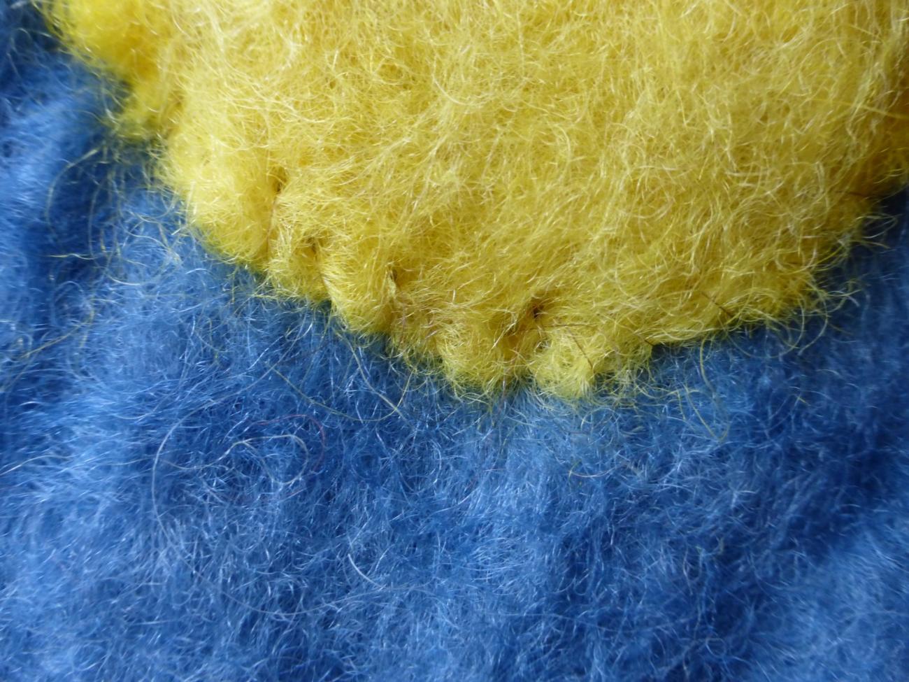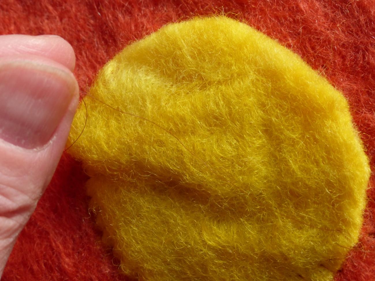 This proved easier from the start. The individual hairs were easier to see and because they are of a coarser texture than human hair, they were easier to feel. These two factors made it easier to both thread the needle and anchor the thread into the felt (see Figure 13). However, the ‘springy’ texture and also the shorter length of the strands made it challenging to keep the stitches in place until the thread was fastened off into the back of the felt again. Because it was easier to securely anchor the hair, it made it possible to use a running stitch as well as over sewing to appliqué the cut outs onto the background felt (See Figure 14).
