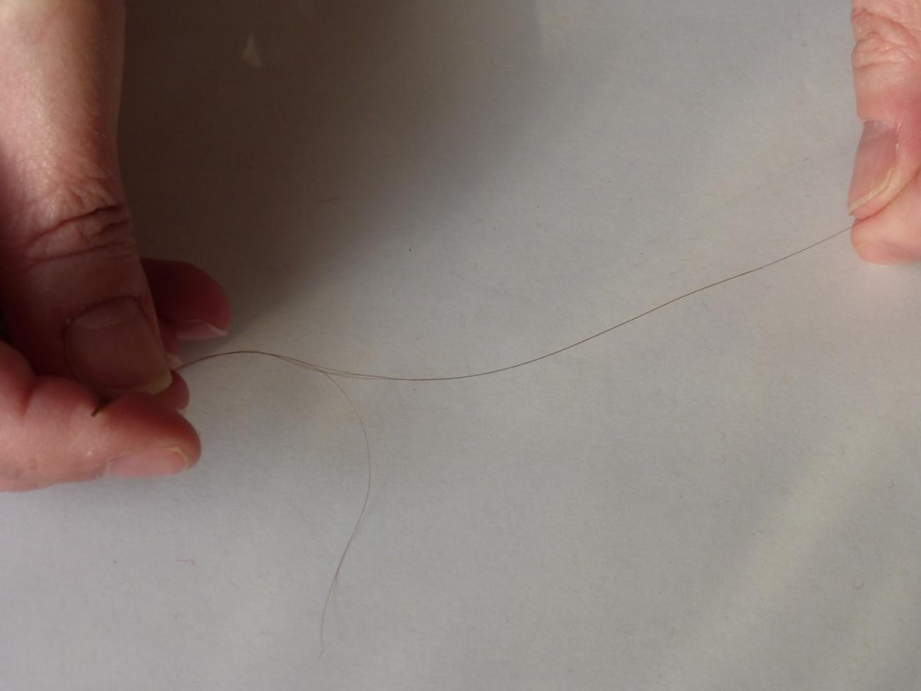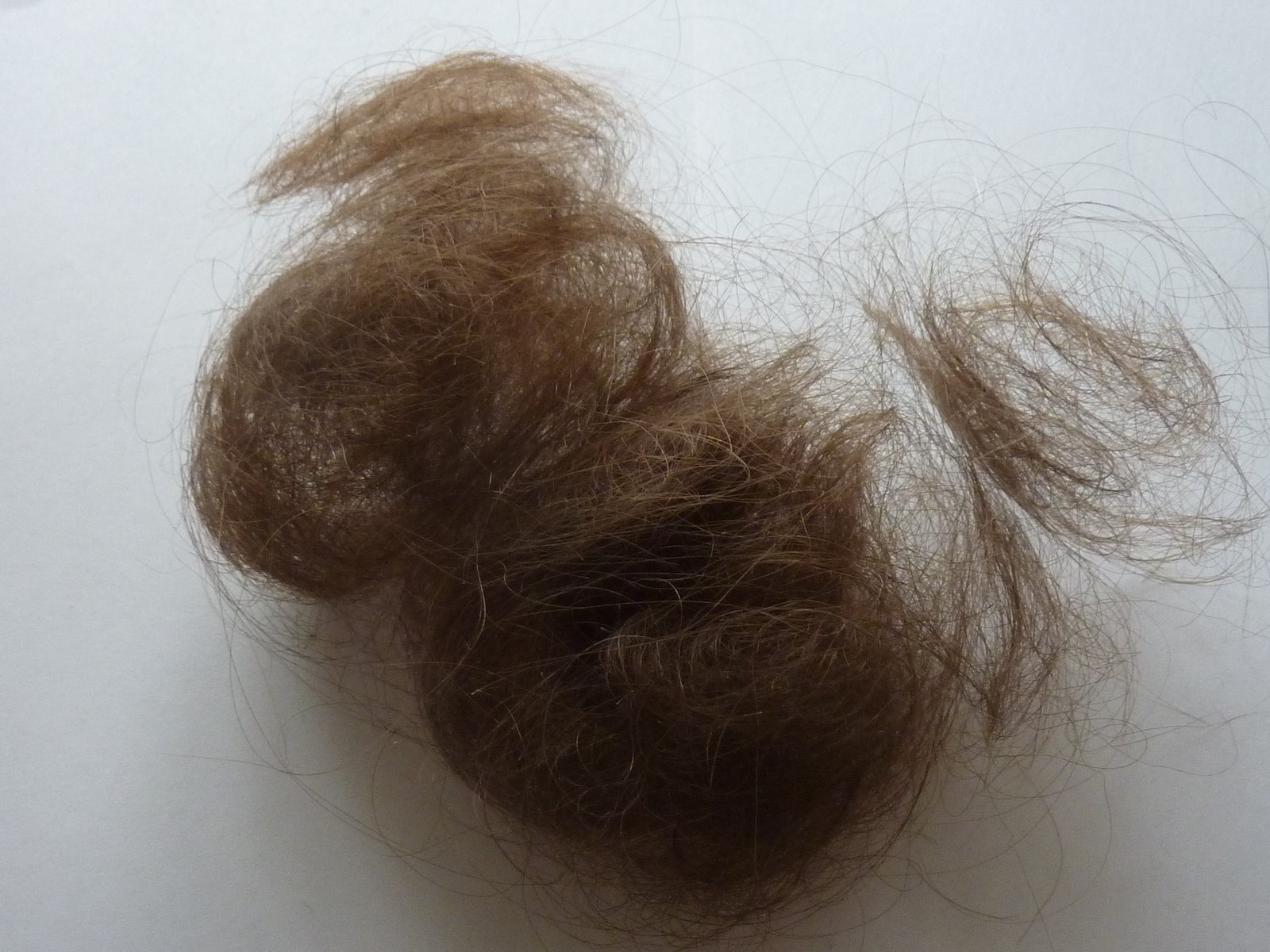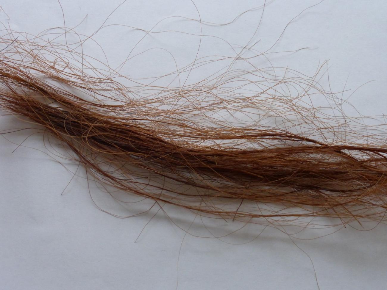 In terms of human hair, there is no evidence to suggest that the Pazyryk’s were ungroomed or didn’t have clean hair and so the sewing could be carried out with my own hair (which isn’t coloured or treated with any chemicals), collected from a hairbrush over a number of weeks (See Figure 3). The horse hair (See Figure 4) was sourced by a kind friend and is believed to be the result of standard grooming.