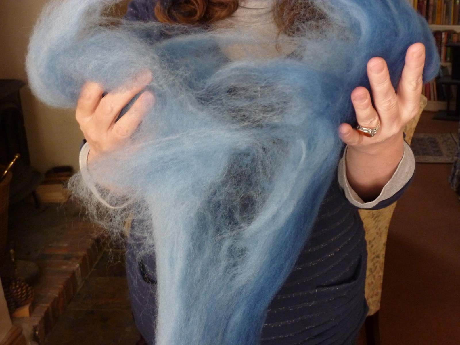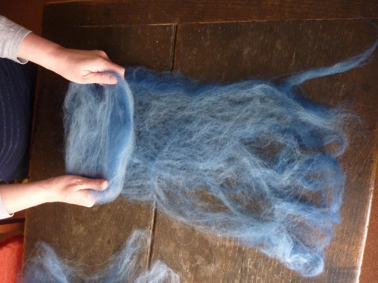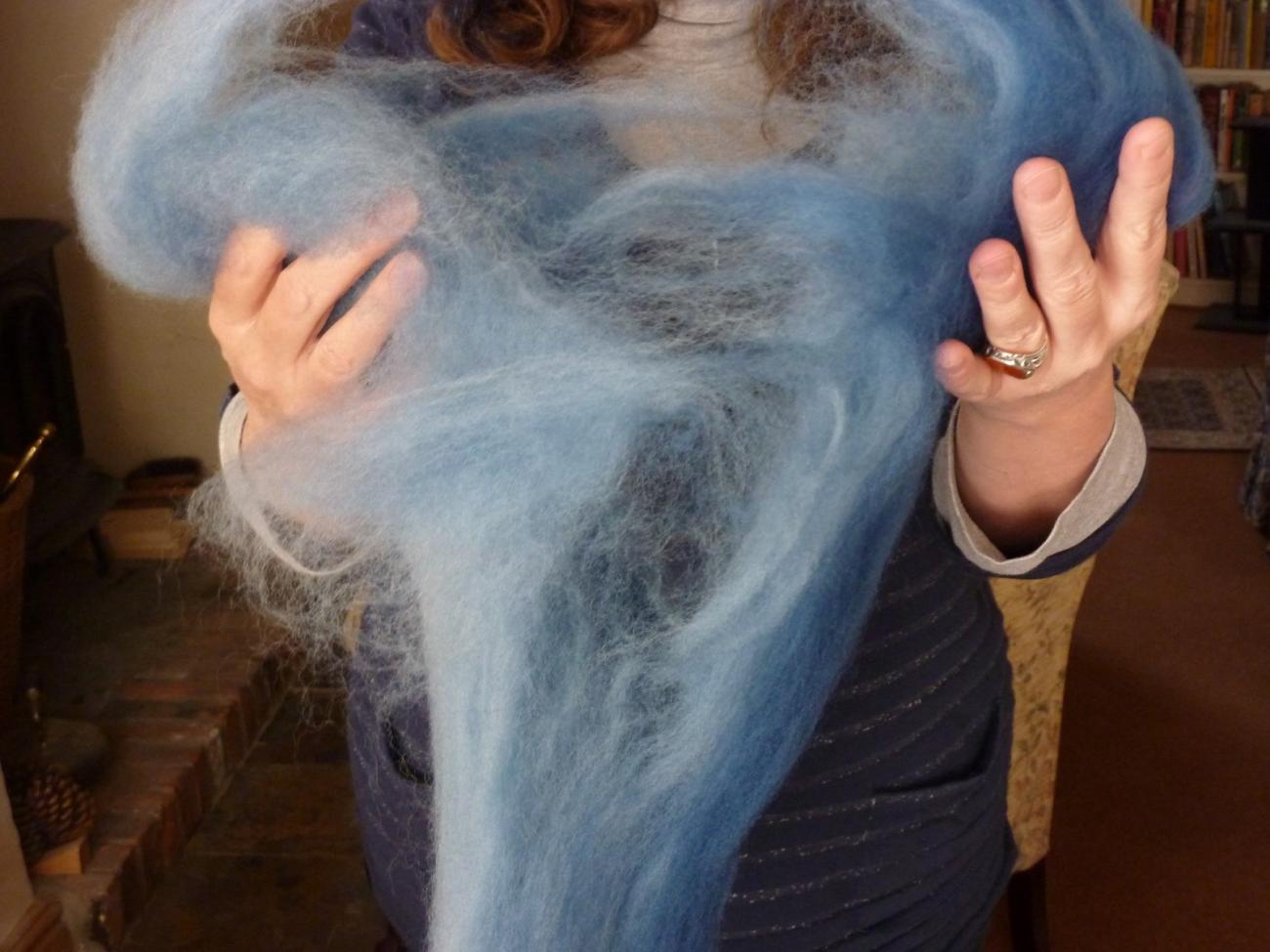 The first step was to make the felt. The process is to separate and spread the wool in layers, alternating the layers at right angles to each other to add strength to the finished fabric (See Figure 5, 6 and 7).