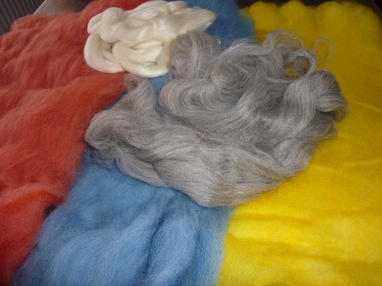 I realised very soon that, the felt would have to mimic that of the shabraks as closely as possible. This meant making the fibre felt 1rather than buying it premade. To this end, I sourced two types of sheep wool (Lincoln and Blue Faced Leicester) already carded and combed, some of it dyed red, yellow and blue with natural pigments, namely madder, weld and woad respectively (See Figure 2).