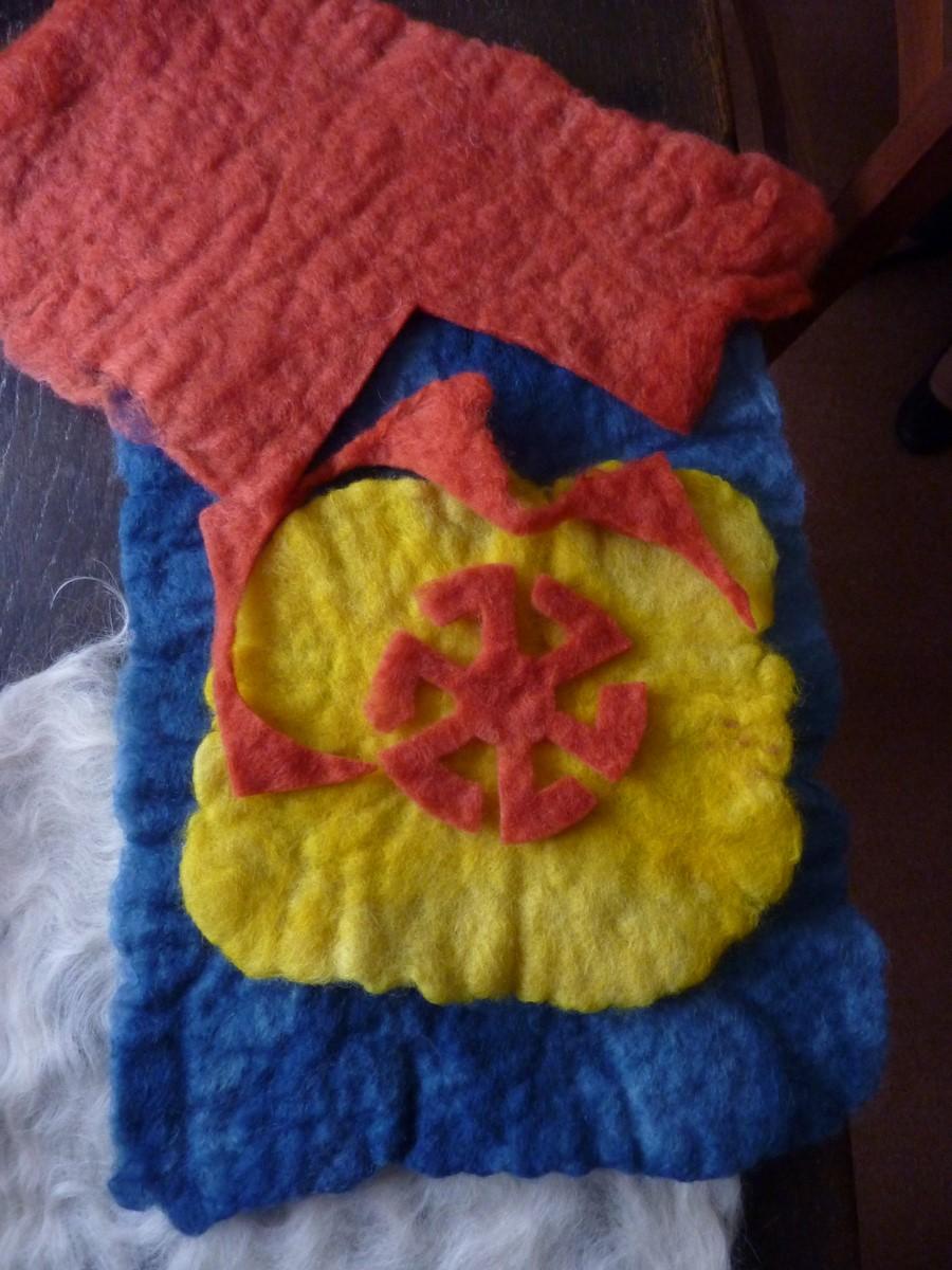 While making the felt was not the focus, it was necessary in order to provide some authenticity. The one thing we know with certainty is that fibre felt was abundant in the Pazyryk kurgans and was the material often used for making the shabraks. While I made the felt without recourse to hot water or soap (both of which are known to aid the process) I did have to use tap water from my bathroom, as well as make the felt in small pieces in a metal tray rather than in large sheets on the ground. The quality of the finished felt is not of particularly high standard but it was sufficient.