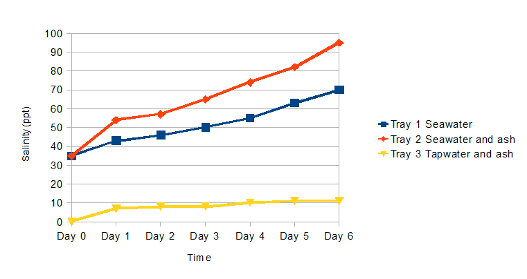 The readings are shown in Figure 2. The brine in tray 1 (seawater only) gained in salinity over the week, doubling from 35 ppt to 70 ppt, an increase of 100%. Conversely, the volume of liquid had halved from 300 ml to 150 ml. The salinity of the brine in tray 2 (ash and seawater) rose more dramatically from 35 ppt to 95 ppt, an increase of 171%. Meanwhile, the volume of brine reduced from 300 ml to approximately 120 ml. In tray 3, the tap water, which had a salinity reading of 0 ppt, gained salinity with the addition of ash, the level of salt increasing from 0 ppt to 11 ppt.
