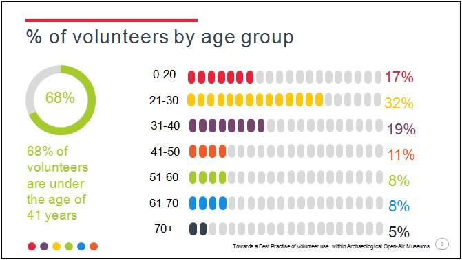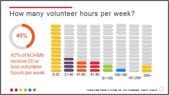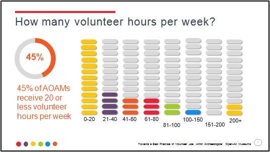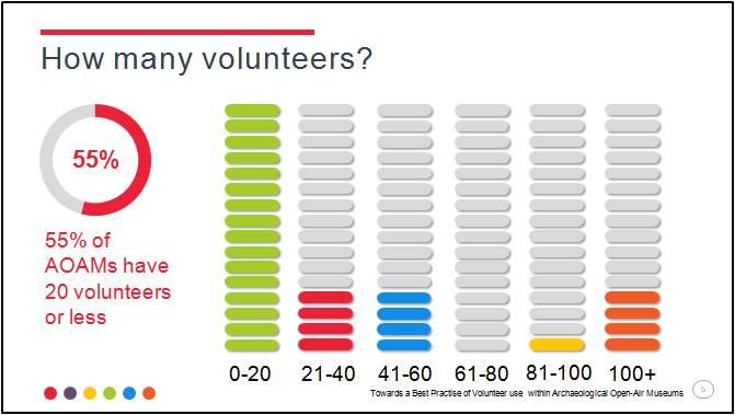 The author has demonstrated that the use of volunteers in AOAMs is widespread and the small number of volunteers is representative of the relatively small size of many of these institutions. However, a number of museums (such as Butser and Eindhoven) utilise large numbers of volunteers. The author surmises that this is a function of commitment to volunteering, location / community, and history -Butser was founded in 1970 and Eindhoven in 1982. Moreover, Sagnlandet Lejre (founded in 1964) utilizes over 200 volunteer hours per week.
