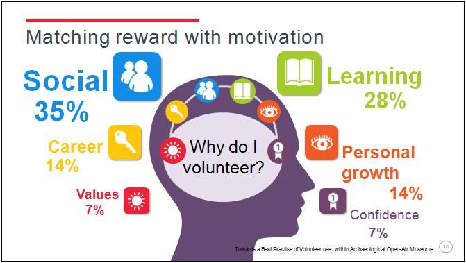Positive social interactions are not just with other volunteers but with staff and, most importantly, with visitors. Motivation is deeply personal and often not completely understood by the individual. The effective volunteer manager shapes reward to reflect the motivations and drives of a variety of volunteers. Understanding a volunteerâs motivations can increase their happiness and their commitment. It is essential not only in retaining experienced individuals but also attracting new volunteers.