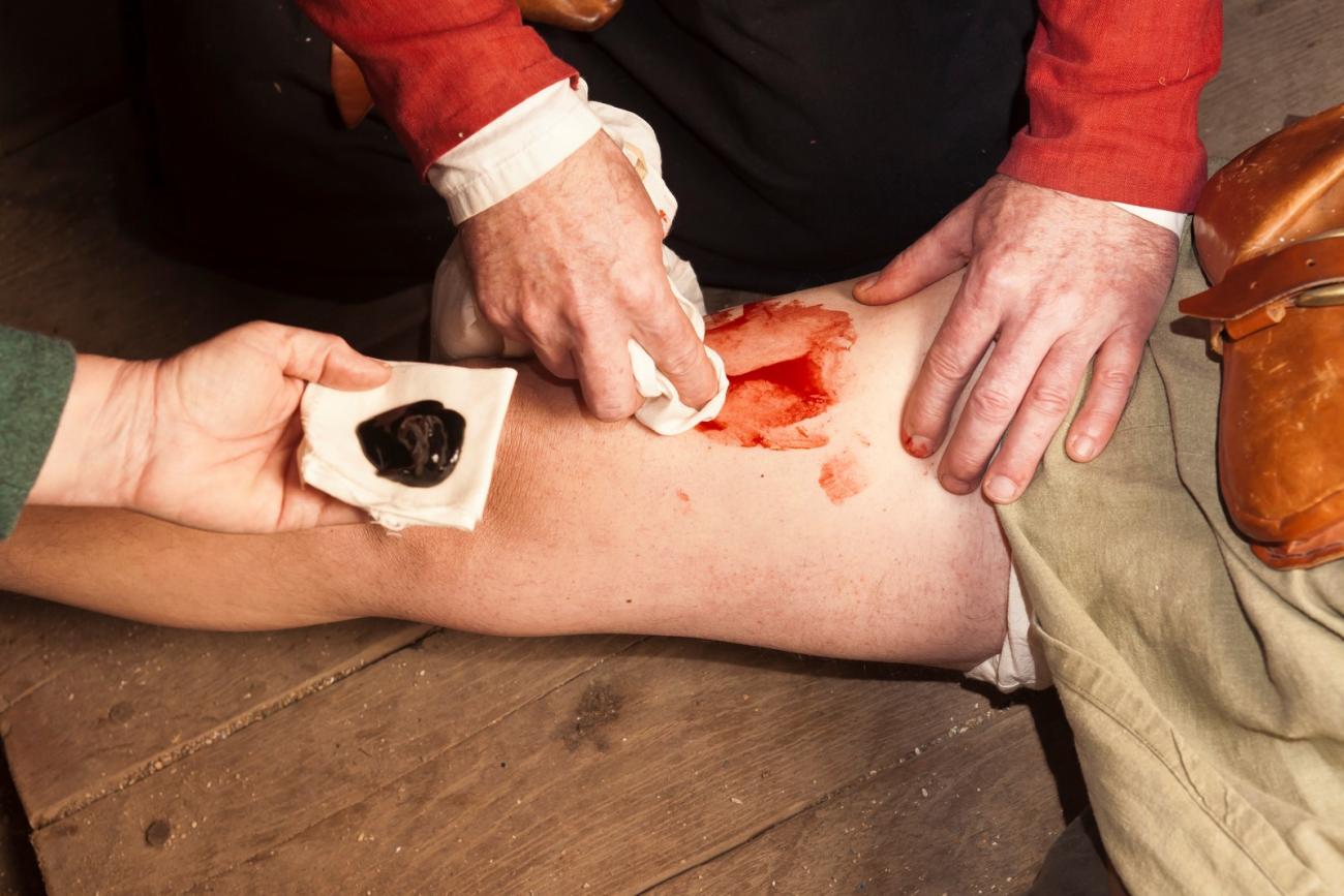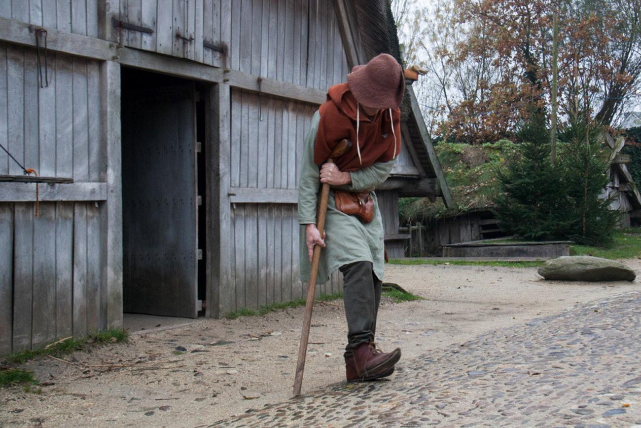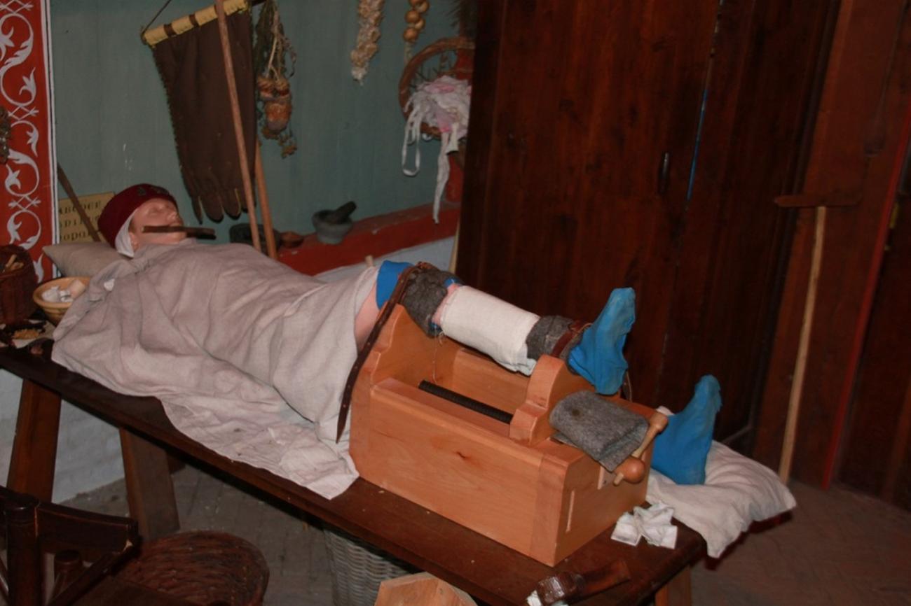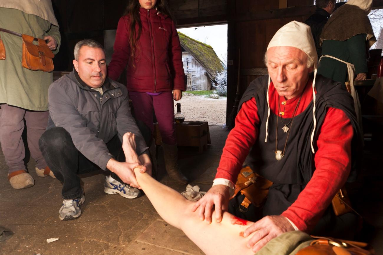 It is the year 1350 in Gravendam (the medieval town of the archaeological open-air museum, (AOAM) Archeon, in the Netherlands). Master Roelof, a wood-and-bone processor, lies unconscious on the stone floor. Shortly before this, he had been climbing the ladder to the attic to grab a log of wood, but it slipped from under him and he ended on the floor. Roelof fainted from the pain, and his leg now lay at a strange angle (See Figure 1). His wife Mette sees that it is not right and hastens to the barber-surgeon for help immediately (See Figure 2). Accidents did happen in the Middle Ages. What could the barber-surgeon have done for Roelof’s broken upper leg? Could he have treated the fracture and the possible complications from this injury? What were Roelof’s chances of survival? In this first article about medical medieval treatments in Archeon, the treatment of this medical problem will be described and interpreted.