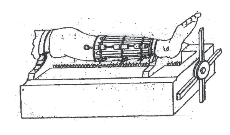 If simple manual traction cannot align the fragments, you use thongs and instruments designed by Hippocrates, and later by Galen. I believe they consisted of a windlass and columns as described by Albucasis, and with pins to hold the position of the windlass. While the traction is in effect, the surgeon will manipulate the fragments and bring the limb to its proper length as compared with the normal side, as insisted by Galen. (Rosenman 2005: 407-8)