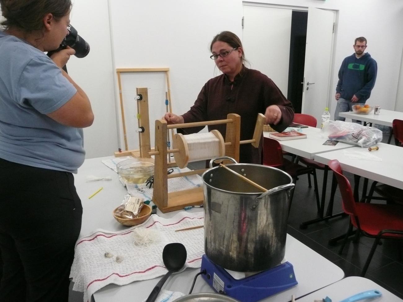 A heartfelt plea was put forward by Sabine Ringenberg when presenting her findings on mordanting substances in historical textiles. Although dyes from archaeological finds are reported and studied, mordants and mordanting tend to be neglected, which in turn influence the conclusions. Sabine presented an overview of traditional testing methods and contemporary developments. This led into this year’s main experiment, arranged by Sabine and Katrin, consisting of an investigation of the effects of the mordant with and without the presence of sulphur, when dyeing linen fabric. This was undertaken in the laboratory and the outdoor space surrounding the buildings. Results and findings will be discussed in context with the experiments undertaken at the European Textile Forum 2014.