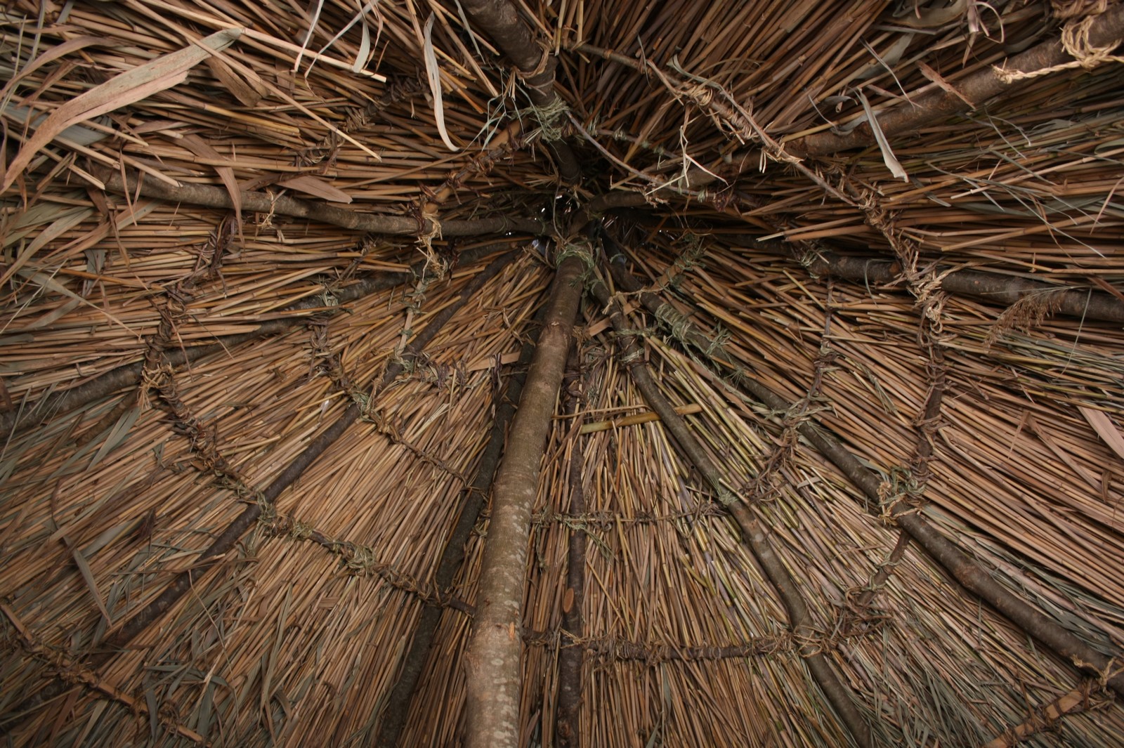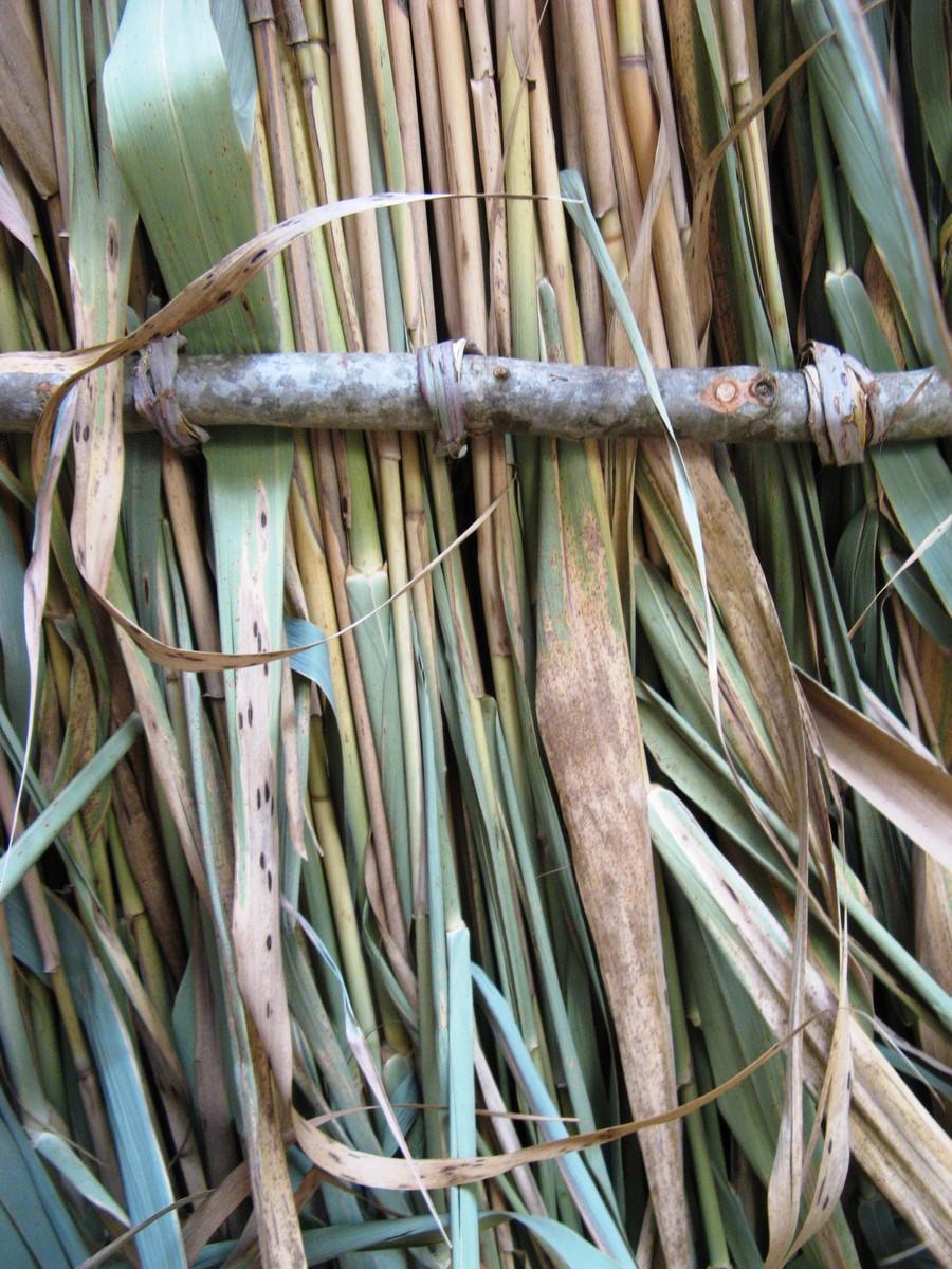 From day 15 until day 21, all activities involved the collection of reeds and their placement to make the roof. The reeds, with all the leaves and the blossoms, were gathered into small groups of 10-15; starting from the lowest row, they were placed all around the structure of the roof, tying them with other ropes and holly branches (See Figures 27-29). At least two people were necessary, working one from the inside and one from the outside, carrying on a ‘sewing’ procedure. The superior row partially overlaps the lower one, with the reeds becoming proportionally shorter as they go up the roof (See Figure 30). With the superimposition of 6 rows of several hundred reeds, the roof was completed and totally waterproof (See Figures 31-32).
