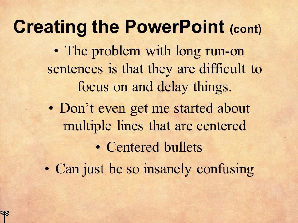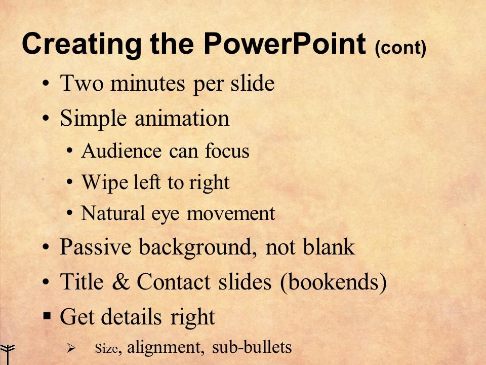 Four bullets, four words per bullet; it’s a good target. Don’t say so much that the text wraps onto a second line. Don’t use sentences. Don’t crowd your slides. There is nothing wrong with adding another slide.
