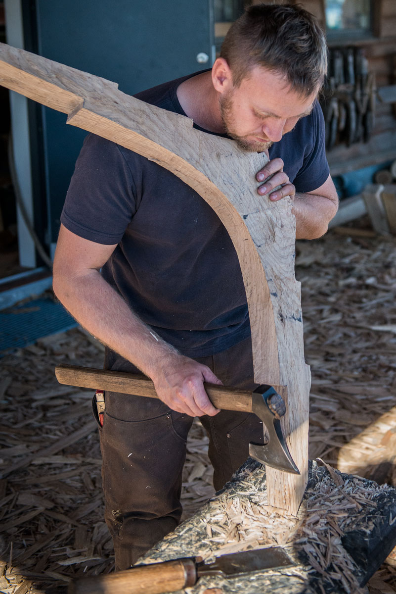 All boat and ship reconstructions built at the Viking Ship Museum boatyard are – as much as is possible – built using replica period tools. Axes dominate the boat builders' tool kit and the various axe types all serve different purposes: the heavy, thick-bladed axe from Skolegade in Århus is effective when felling trees, the bearded axes from Sæbø and Gjermundbu are best suited for shaping along specific lines and making finer adjustments, while the broad-bladed axes from Hedeby and Over Hornbæk are used to shape and smooth the face of planks and other longitudinal timbers. Knives, chisels, spoon-shaped augers, bow drills, clamps, adzes, planes, peening (riveting) hammers and profile scrapers complete the tool kit, and their use in late Viking Age/early medieval boatbuilding is attested archaeologically, either through recovery of tools during excavation or in the tool marks present on excavated ship and boat timbers (Finderup 2006).
